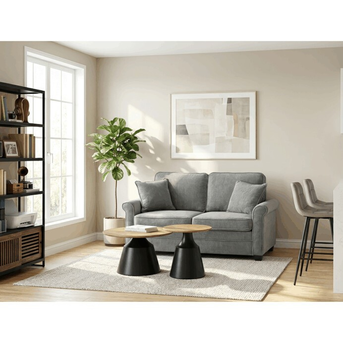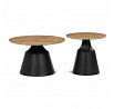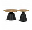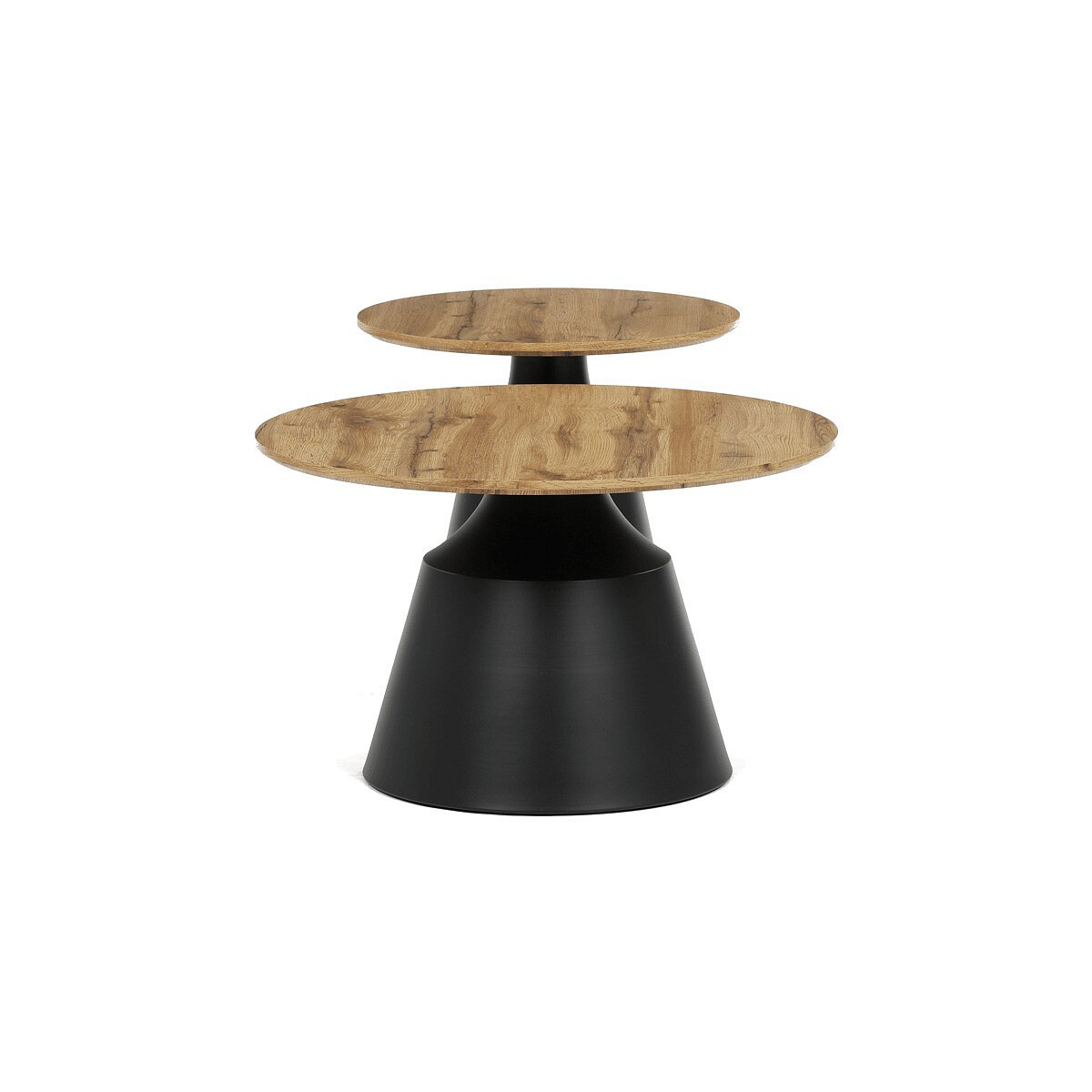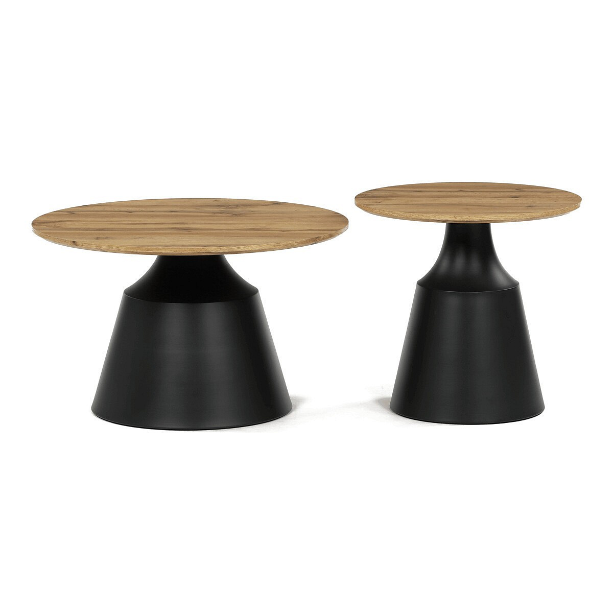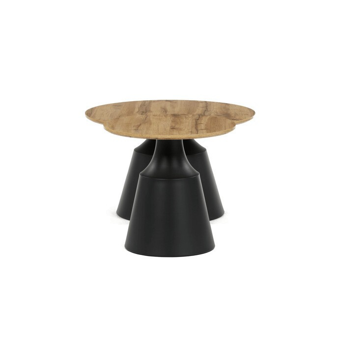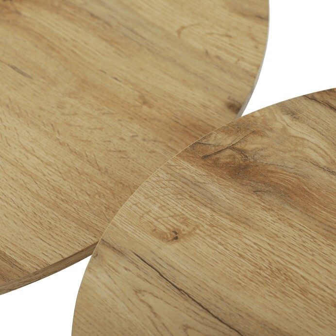 Sada dvou konferenčních stolů kombinuje desky z MDF s dekorativním povrchem v odstínu dub artisan a stabilní kovové podnože v černé barvě. Desky mají matnou úpravu, která usnadňuje údržbu a zajišťuje dlouhodobou odolnost proti běžnému opotřebení. Větší stůl má průměr 70 cm a výšku 42,5 cm, menší pak průměr 50 cm a výšku 47,5 cm, což umožňuje variabilní uspořádání v prostoru. Kovová podnož je navržena pro pevnost a stabilitu, čímž zajišťuje bezpečné používání. Moderní design s kontrastem přírodního dekoru a černé barvy se hodí do různých interiérů.