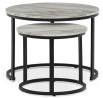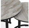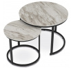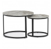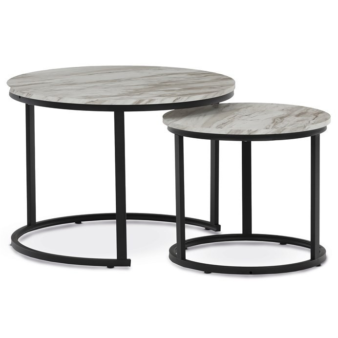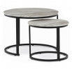 Set dvou konferenčních stolků s deskami z MDF v dekoru bílého mramoru nabízí moderní a praktické řešení pro obývací pokoj. Desky jsou opatřeny matnou povrchovou úpravou, která usnadňuje údržbu a zachovává přirozený vzhled mramorového dekoru. Podnože jsou vyrobeny z pevného kovu s černým lakem, který zajišťuje stabilitu a dlouhou životnost. Menší stolek lze zasunout pod větší, což umožňuje flexibilní využití prostoru. Výška většího stolku je 50 cm, což je ideální rozměr pro pohodlné odkládání nápojů či dekorací.