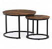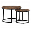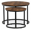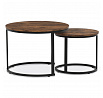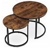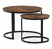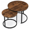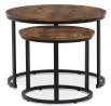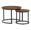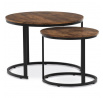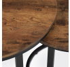 Set dvou konferenčních stolků kombinuje desky z MDF s dekorem starého dřeva a pevnou kovovou podnož v černém matném laku. Kulaté desky o hnědém odstínu s texturou připomínající přírodní dřevo vytvářejí příjemný vizuální efekt, který doplňuje minimalistická kovová podnož s kruhovým tvarem. Výška většího stolku je 50 cm, což zajišťuje pohodlné využití v obývacím prostoru. Stolky jsou navrženy tak, aby se daly snadno kombinovat a prostorově efektivně uspořádat, přičemž pevná kovová podnož zaručuje stabilitu a dlouhou životnost. Matný povrch desek se snadno udržuje a odolává běžnému opotřebení.