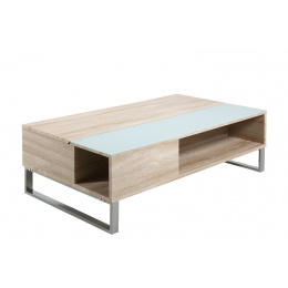 Konferenční stolek Azalea je funkční stolek pro moderní obývací pokoj. Stůl byl vyroben z překližky s dýhou v barvě běleného dubu. Polovina desky byla pokryta 5mm mléčným sklem. Základnu stolku tvoří kovové matné nohy. Díky tomu, že byly natřeny práškově, jsou dokonale pokryty stříbrným barvivem. Stolek je otevíratelný shora. Má dvě police a úložný prostor. Výška: 35/55 Šířka: 110 Hloubka: 60