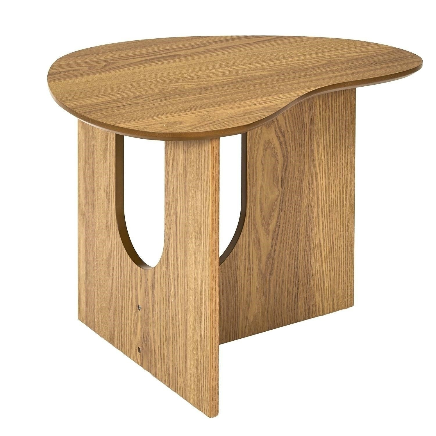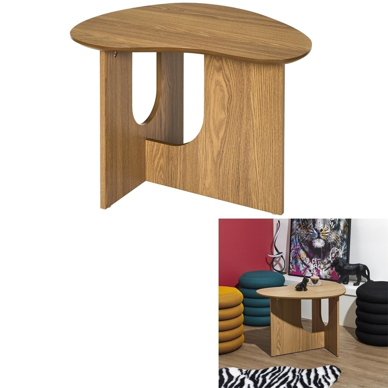 Konferenční stolek s oblými, organickými tvary je kvintesencí stylu japandi nebo boho. Stolek s netypickou základnou skládající se ze 2 desek bude ideálním nábytkem do obývacího pokoje nebo čekárny. Deska stolu s nepravidelným tvarem mu dodává nadčasový vzhled. Vyžaduje montáž Materiál: MDF deska s dýhou imitující dub. Max. zatížení stolku 20 kg