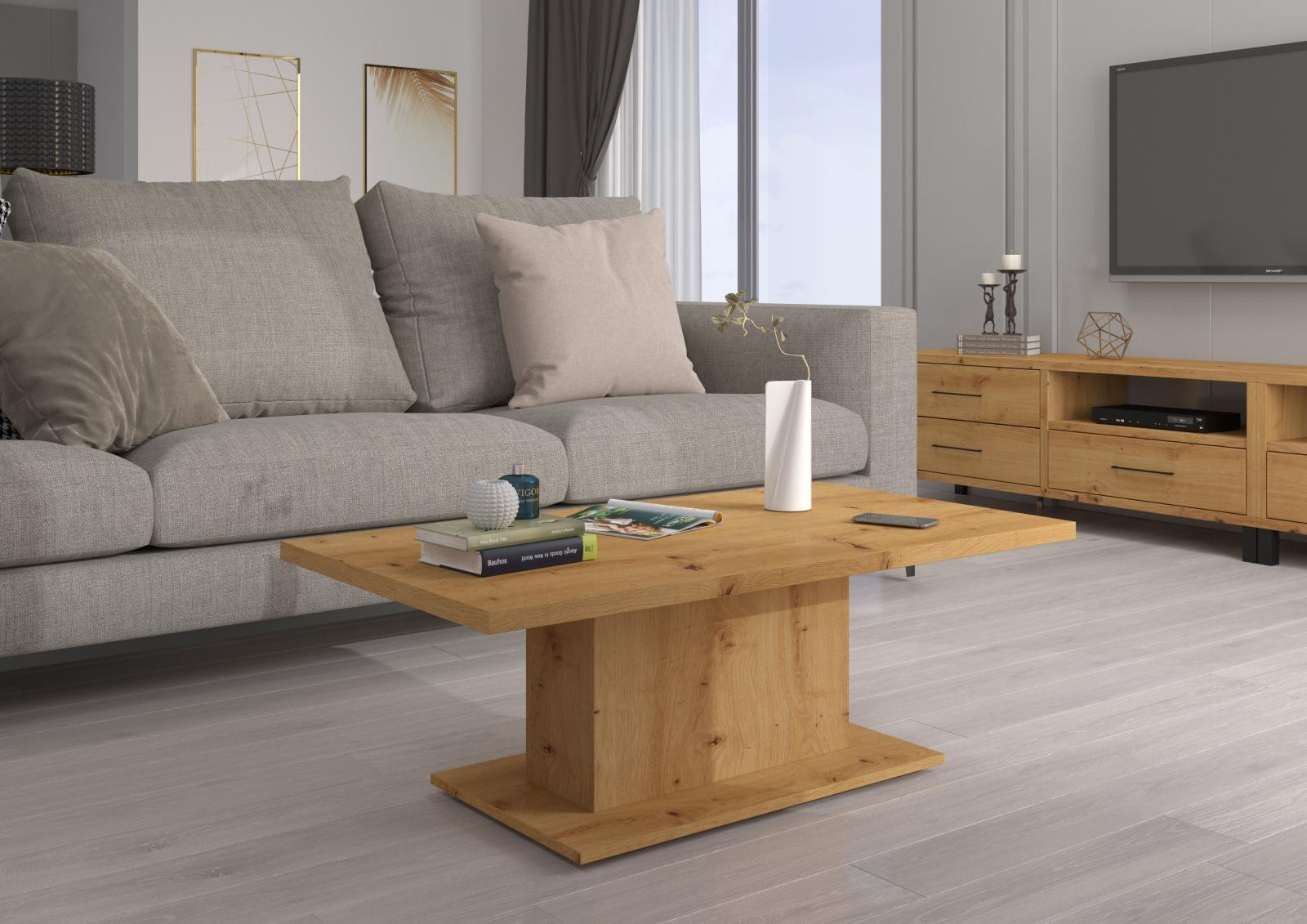 Konferenční stolek Denis je atraktivní stolek, který je vyrobený z lamina ve velmi oblíbeném a moderním dekoru dub artisan. Stolek je dostatečně velký na vše, co si budete potřebovat odložit. Hrnek s kávou nebo čajem, talíř, knihu, telefon, notebook, nebo klidně i unavené nohy po celodenním maratonu. Stolek je dodávaný v demontu. Součástí balení je montážní plánek včetně všech potřebných spojovacích materiálů. Vyobrazené doplňky a dekorace nejsou v ceně.