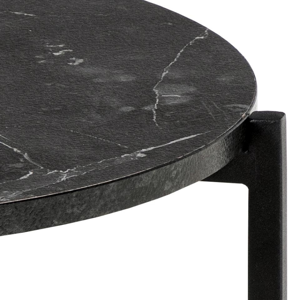 Jednoduchý konferenční stolek Lamoine, ale s promyšlenými detaily. Tento konferenční stolek vytváří klidnou atmosféru v domě díky kulaté desce s vzhledem černého mramoru. Tenká ocelová základna poskytuje několik zajímavých detailů, jako je způsob, jakým se připojuje k desce stolu. Moderní konferenční stolek se zajímavými detaily. Deska z MDF s vzhledem černého mramoru. Kovová, matná základna lakovaná práškovou barvou na černo. Certifikát FSC. Vyžaduje montáž. Max. zatížení 20 kg Váha stolu: 2,1 kg