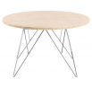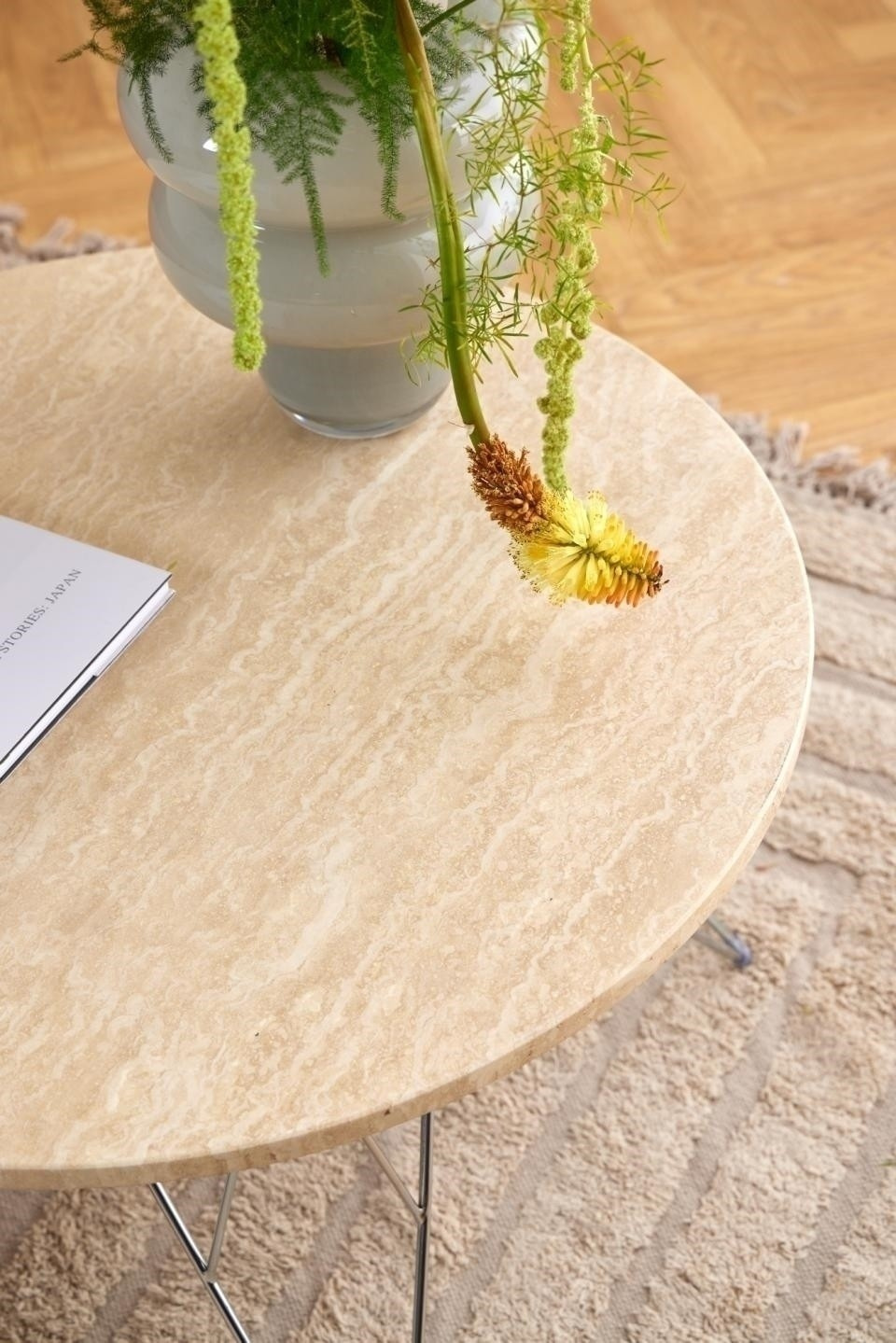 Kulatý konferenční stolek Prunus, deska z travertinu lakovaného na matnou béžovou, drátěná základna z chromované oceli. Tento konferenční stolek se zalíbí jak minimalistům, tak maximalistům. Má efektní desku z travertinu, která je podepřena na chromovaném drátěném podstavci. Vyvážený kontrast mezi proporcemi dodává projektu lehký půvab. Snadno se přizpůsobí každému stylu interiéru. Hmotnost stolku 30 kg. Rozměry kartonů: 14x87x100cm a 66x43x14,8cm