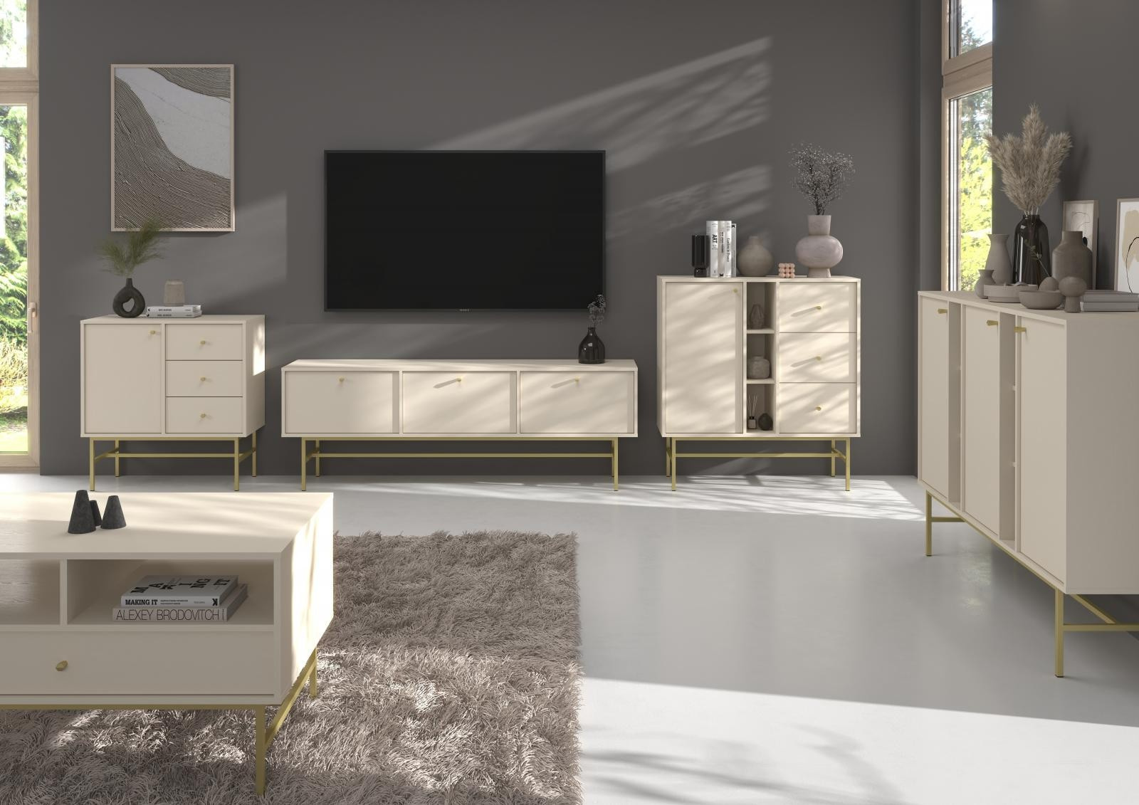 Série Tomila nabízí noční, TV i konferenční stolky, vitríny a komody v široké škále tvarů, barev a typů noh.