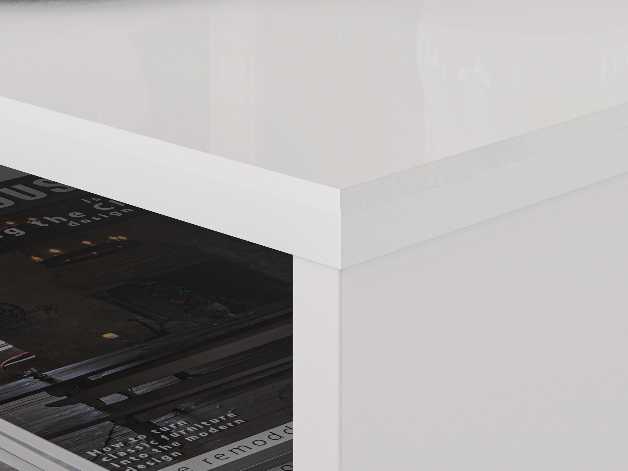- Frézovaná MDF deska v bílém lesku je použita na dvířkách a vrchních částech nábytku