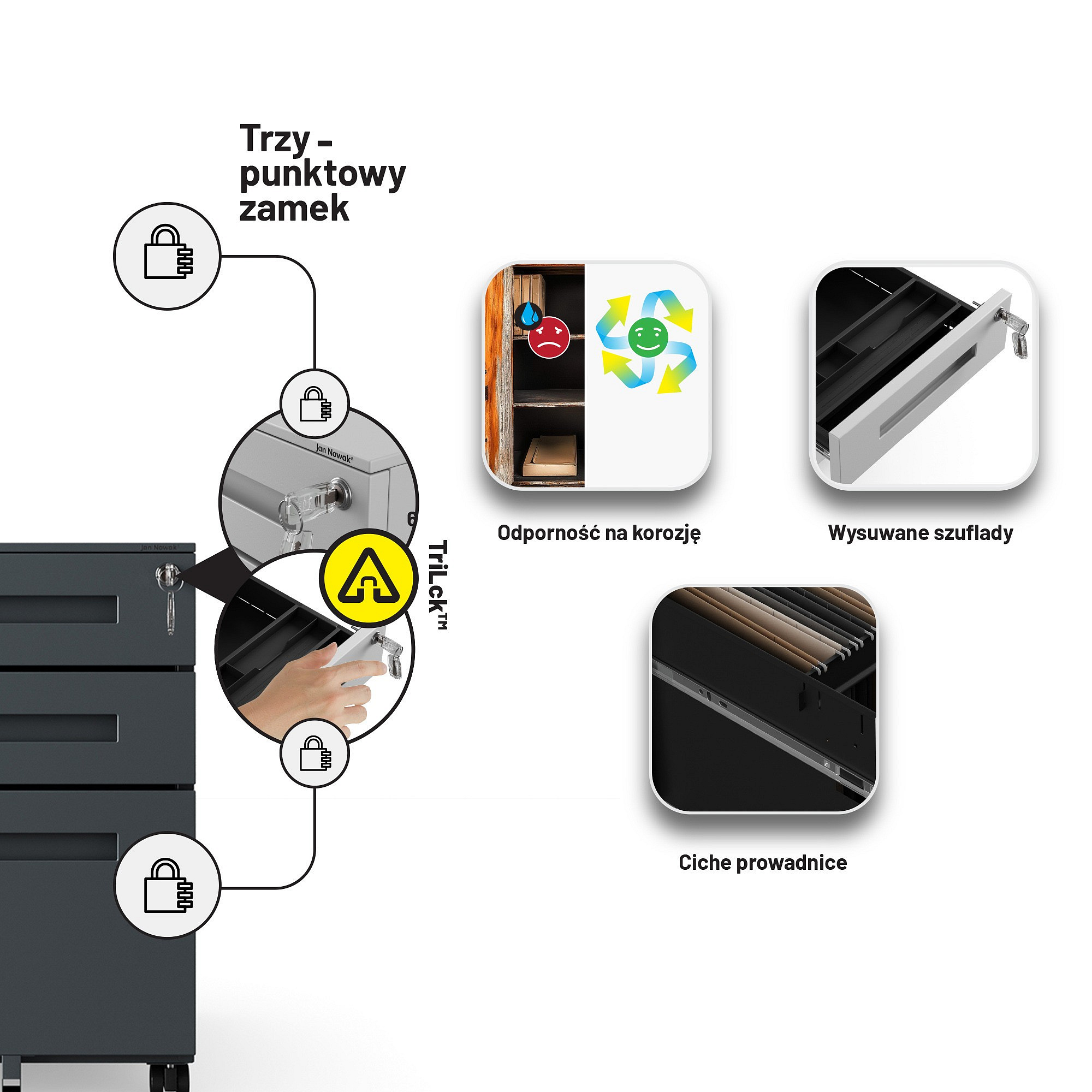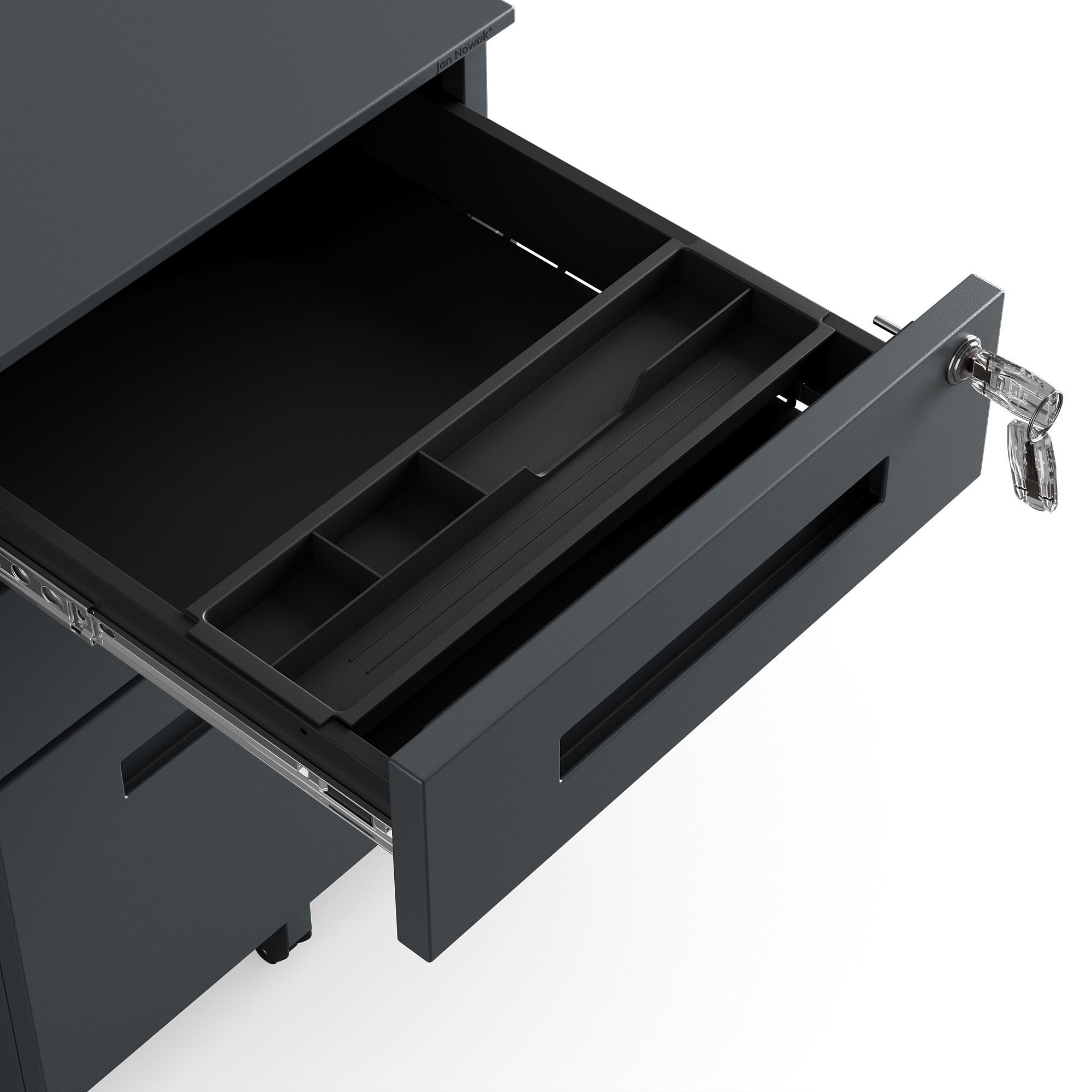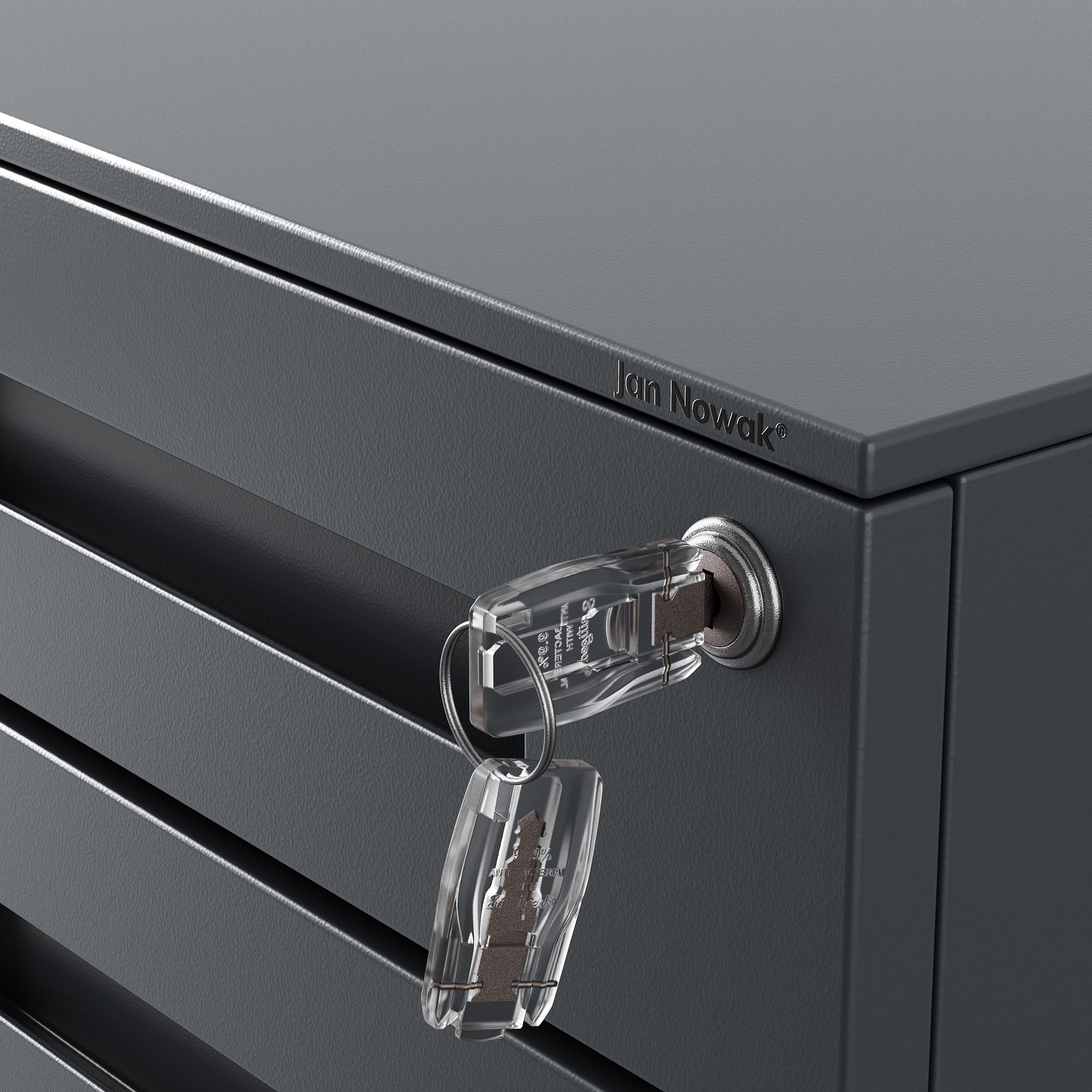 Uchovejte své důležité dokumenty a osobní věci v bezpečí. Kontejner KATE je vybaven pevným centrálním zámkem, který uzamkne všechny zásuvky najednou. Můžete si být jisti, že vaše citlivé informace jsou chráněny před neoprávněným přístupem.
