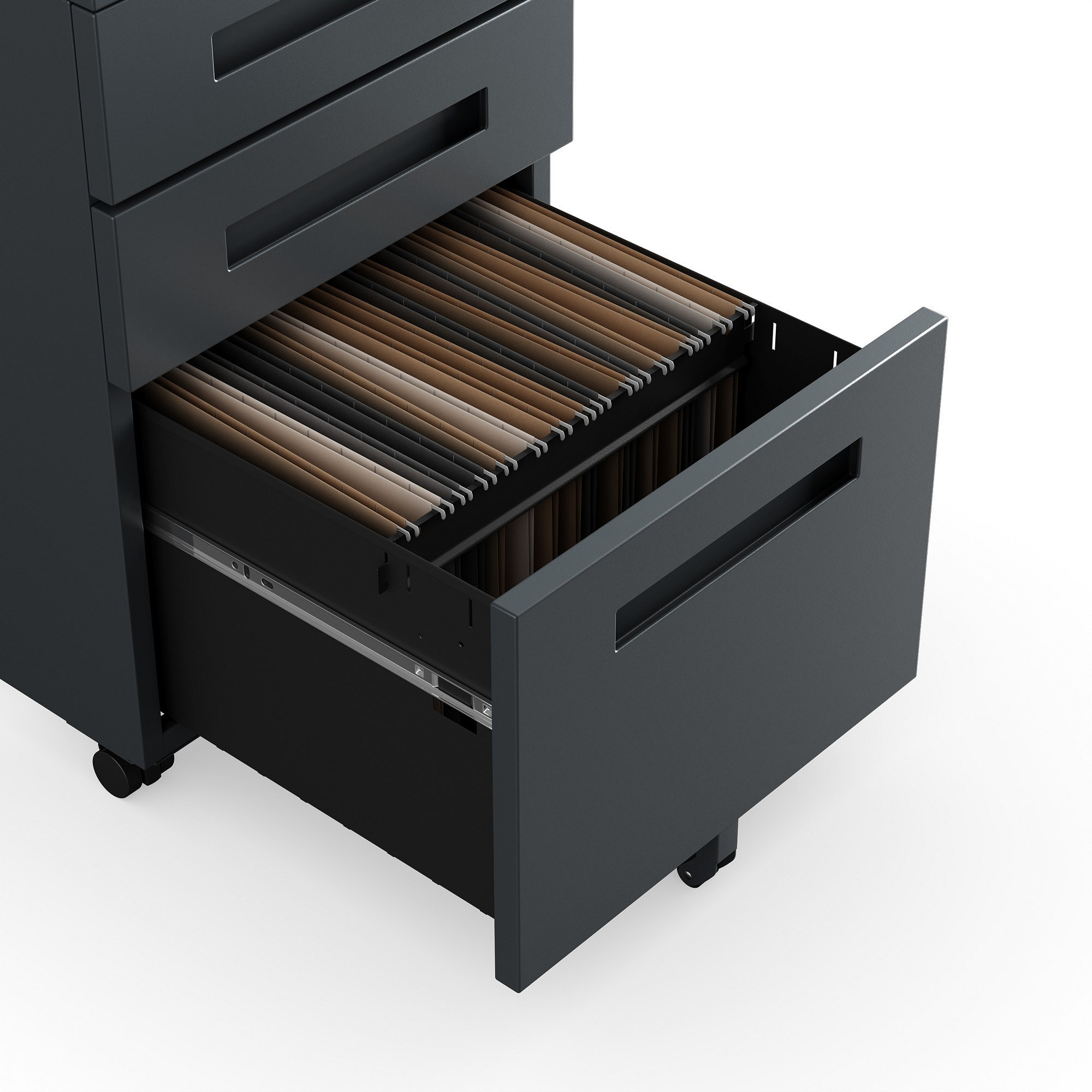 Dolní, větší zásuvka (280 mm) je vybavena pohyblivou tyčí na závěsné složky, která umožňuje ukládání dokumentů ve formátech A4/F4. Můžete si tak snadno uspořádat důležité dokumenty a mít je vždy po ruce.