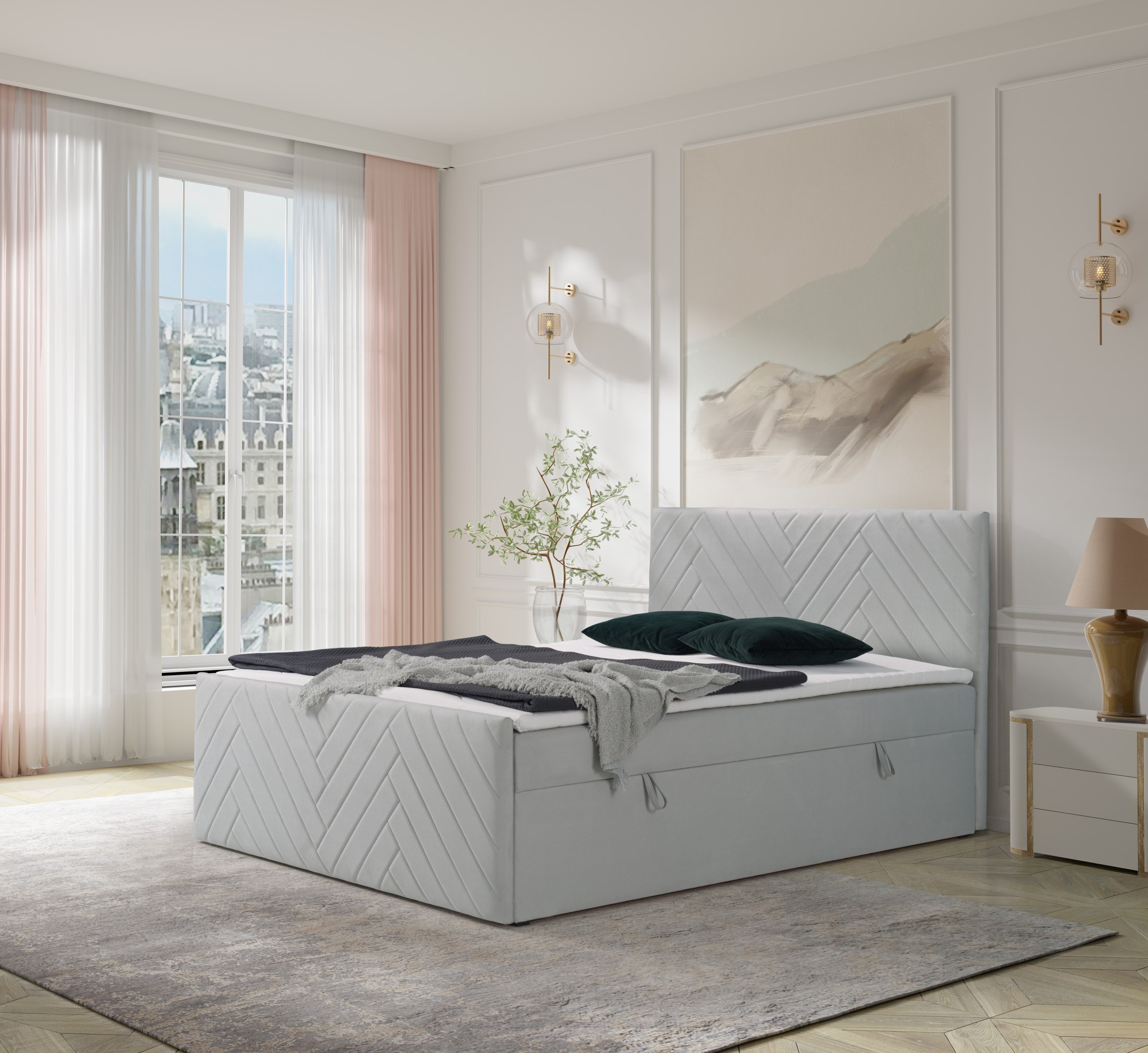 - Spodní boxspring: Pevný základ postele, který zajišťuje stabilitu a optimální podporu pro horní matrace. Boxspring je potažen kvalitní látkou, která dodává posteli elegantní vzhled.