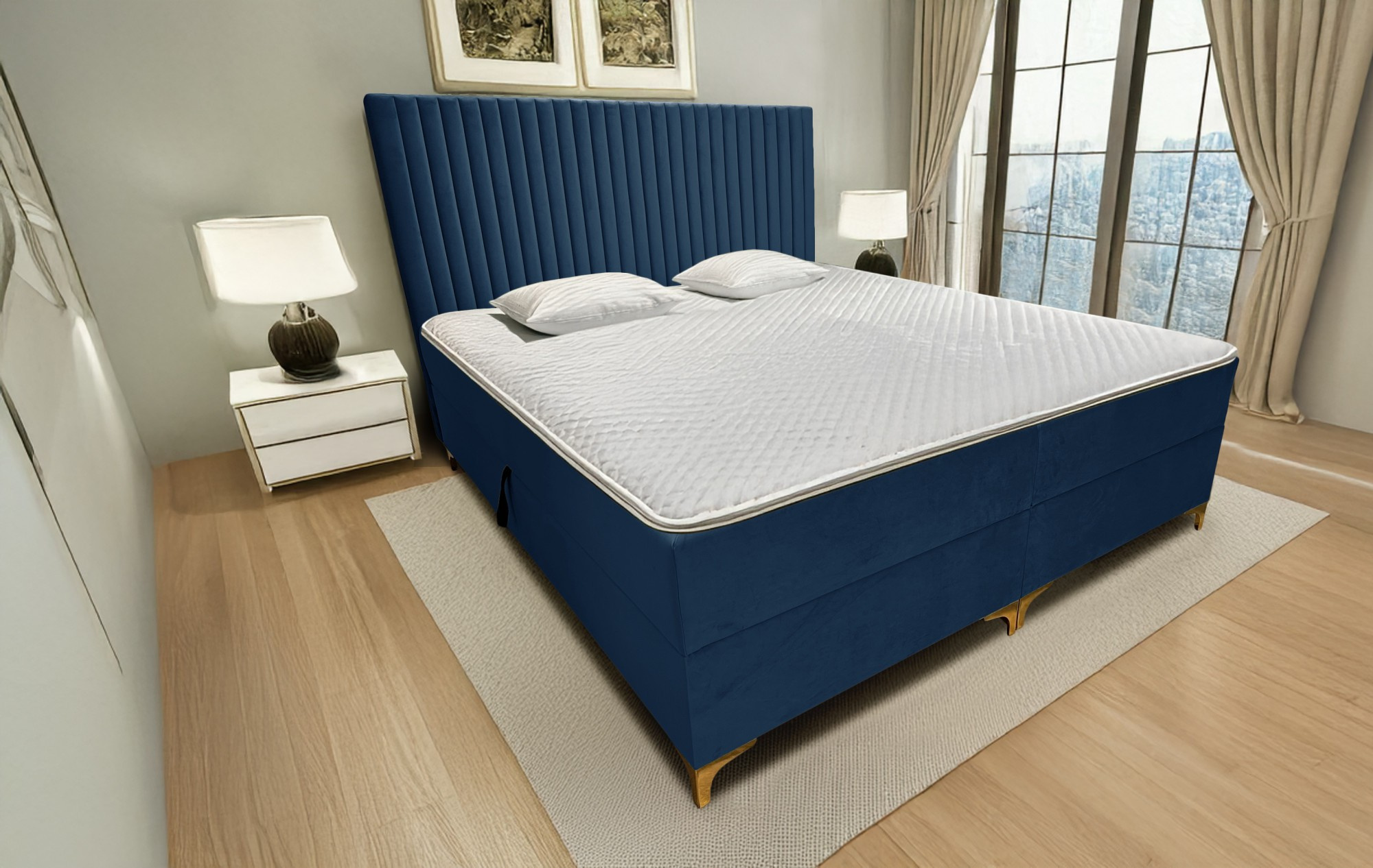 - Spodní boxspring: Pevný základ postele, který zajišťuje stabilitu a optimální podporu. Obsahuje pružinové jádro, které tlumí pohyby a zvyšuje komfort.