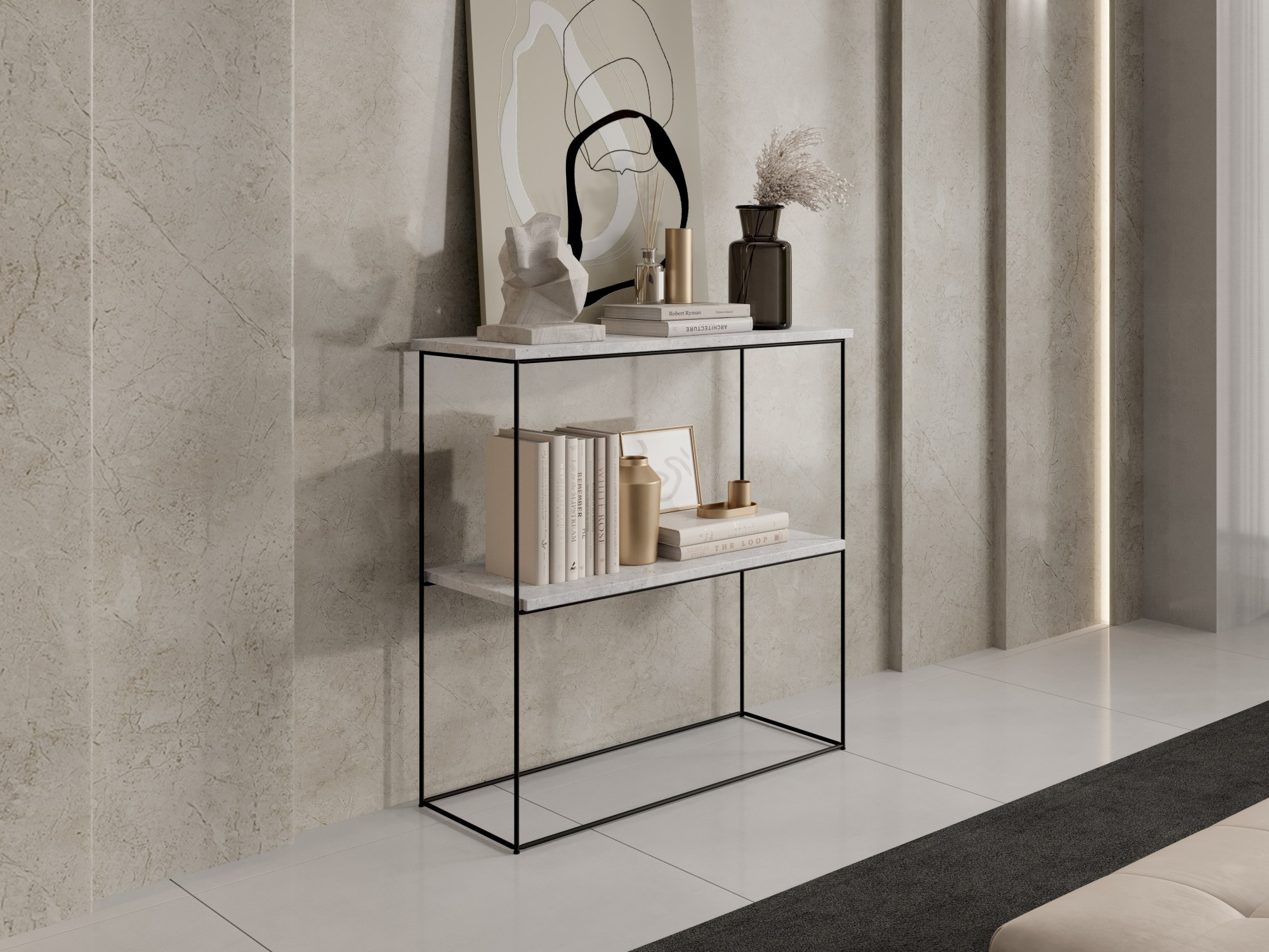 Konzole Toni je elegantní a moderní nábytek, který se dokonale hodí do různorodých interiérů, od minimalistických po více eklektické. Charakteristickým prvkem této konzole je noha vyrobená z drátu, která jí dodává lehkost a moderní vzhled. Prostá forma blatu ideálně harmonizuje s jemným tvarem kovové základny, tvořící harmonický celek.