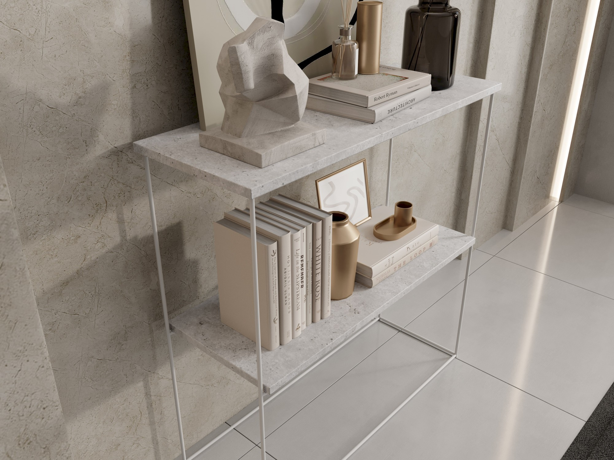 Konzole Toni je elegantní a moderní nábytek, který se dokonale hodí do různorodých interiérů, od minimalistických po více eklektické. Charakteristickým prvkem této konzole je noha vyrobená z drátu, která jí dodává lehkost a moderní vzhled. Prostá forma blatu ideálně harmonizuje s jemným tvarem kovové základny, tvořící harmonický celek.