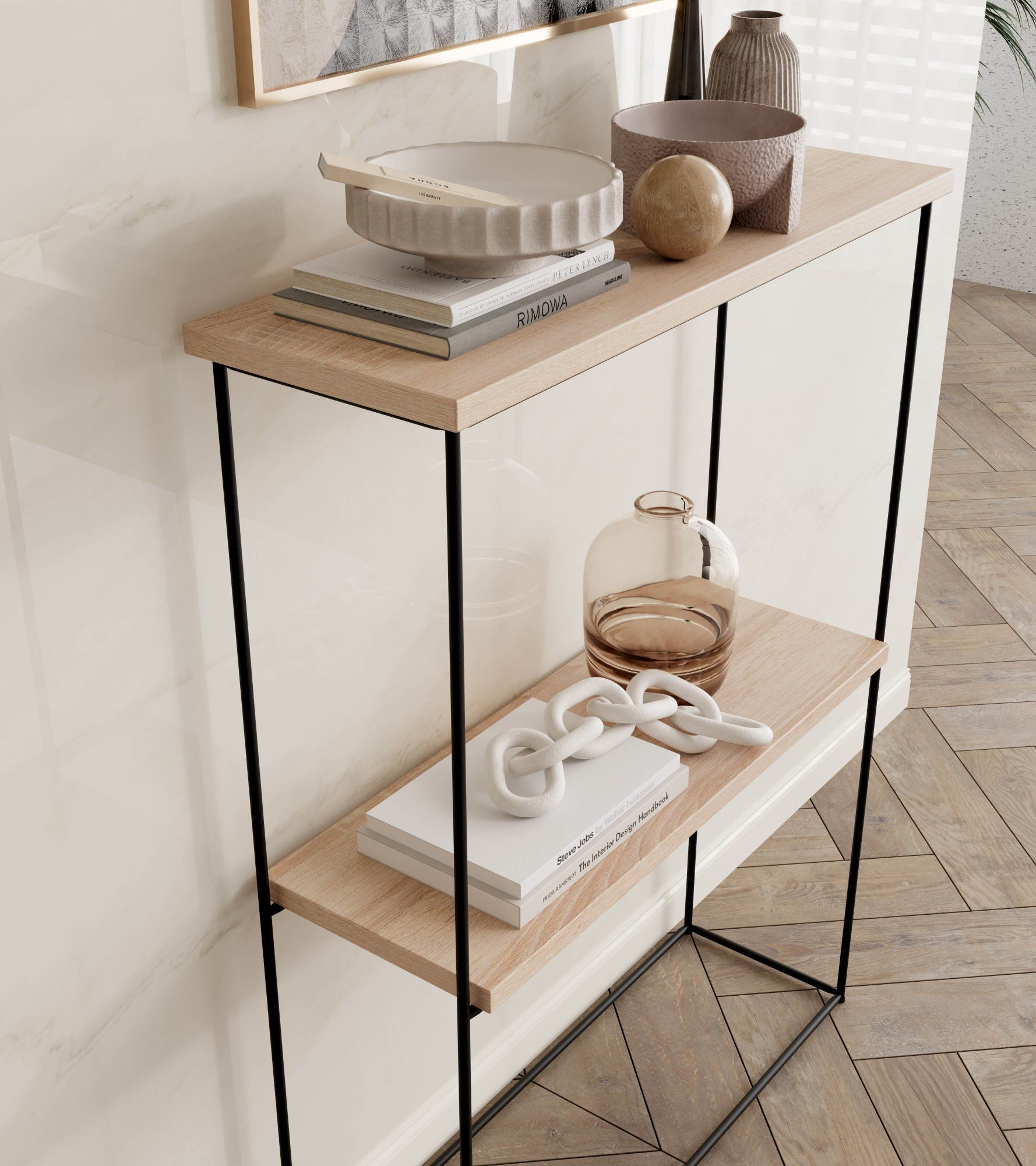 Konzola Velo z drátu je elegantní a moderní prvek vybavení interiéru, který se vyznačuje minimalistickým designem a vysokou funkčností. Konzola Velo z drátu je funkční a stylový nábytek, který jistě dodá kouzlo každému interiéru, zároveň nabízí praktická řešení pro ukládání a vystavování předmětů.