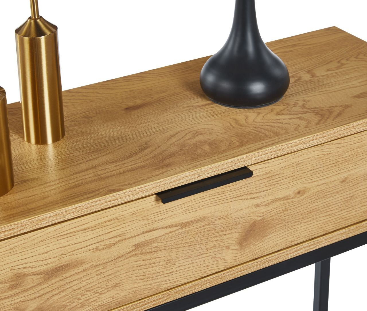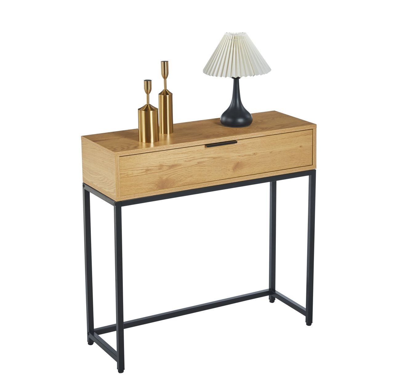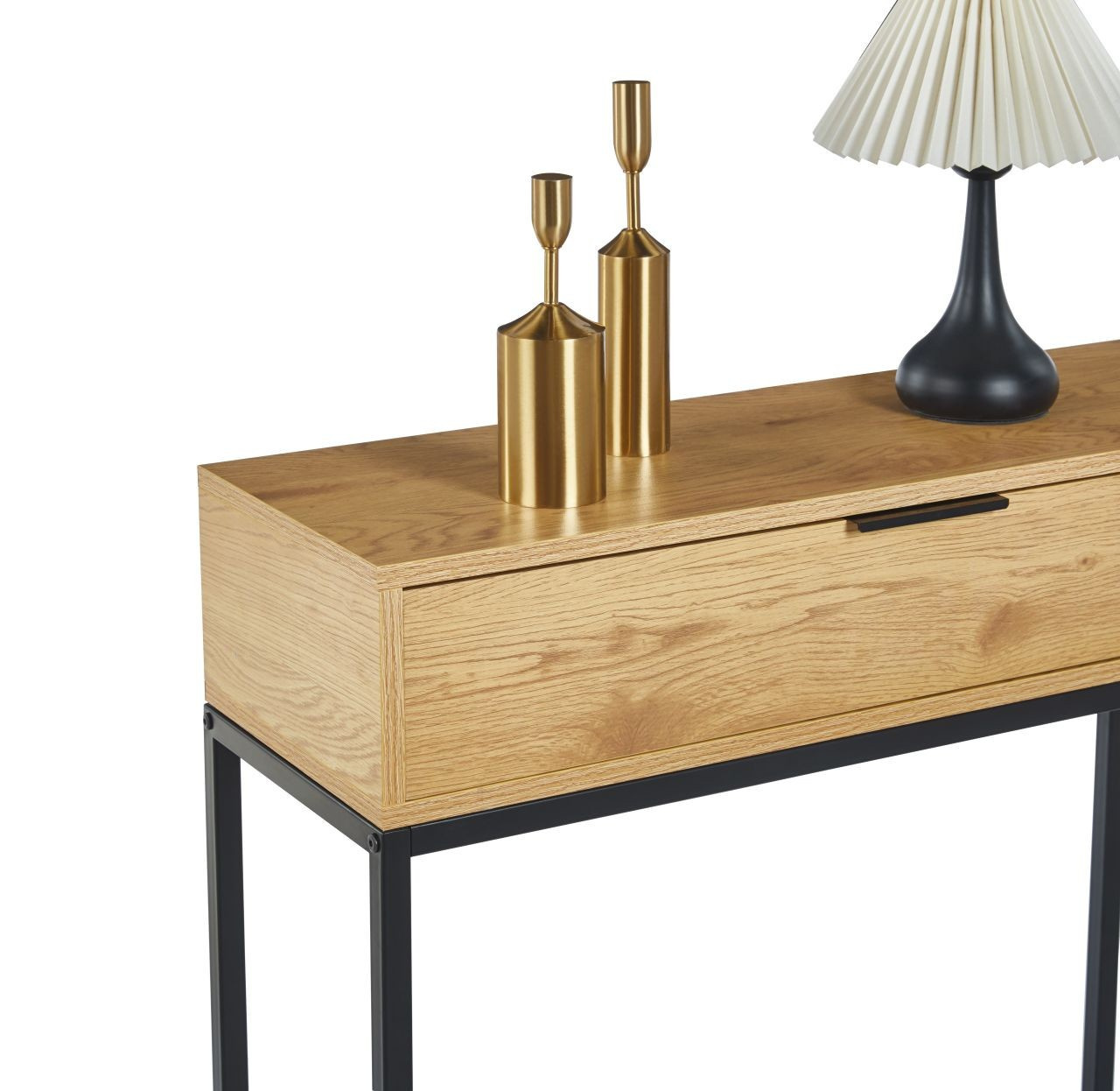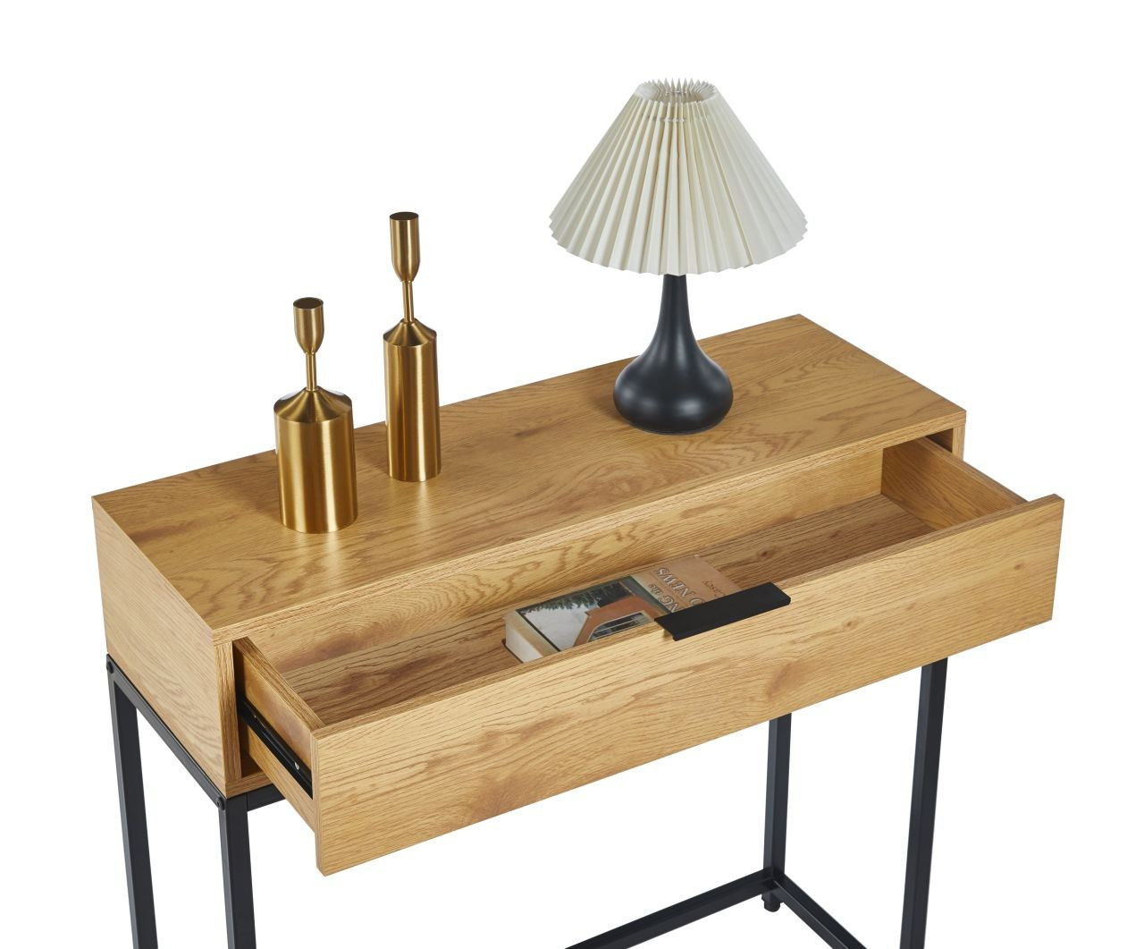 ROZMĚRY: - hloubka: 28 cm - šířka: 80 cm - výška: 77 cm MATERIÁL: - laminovaná dřevotříska + práškově lakovaný kov BARVA: - přírodní dub + černá OSTATNÍ: - zásuvka