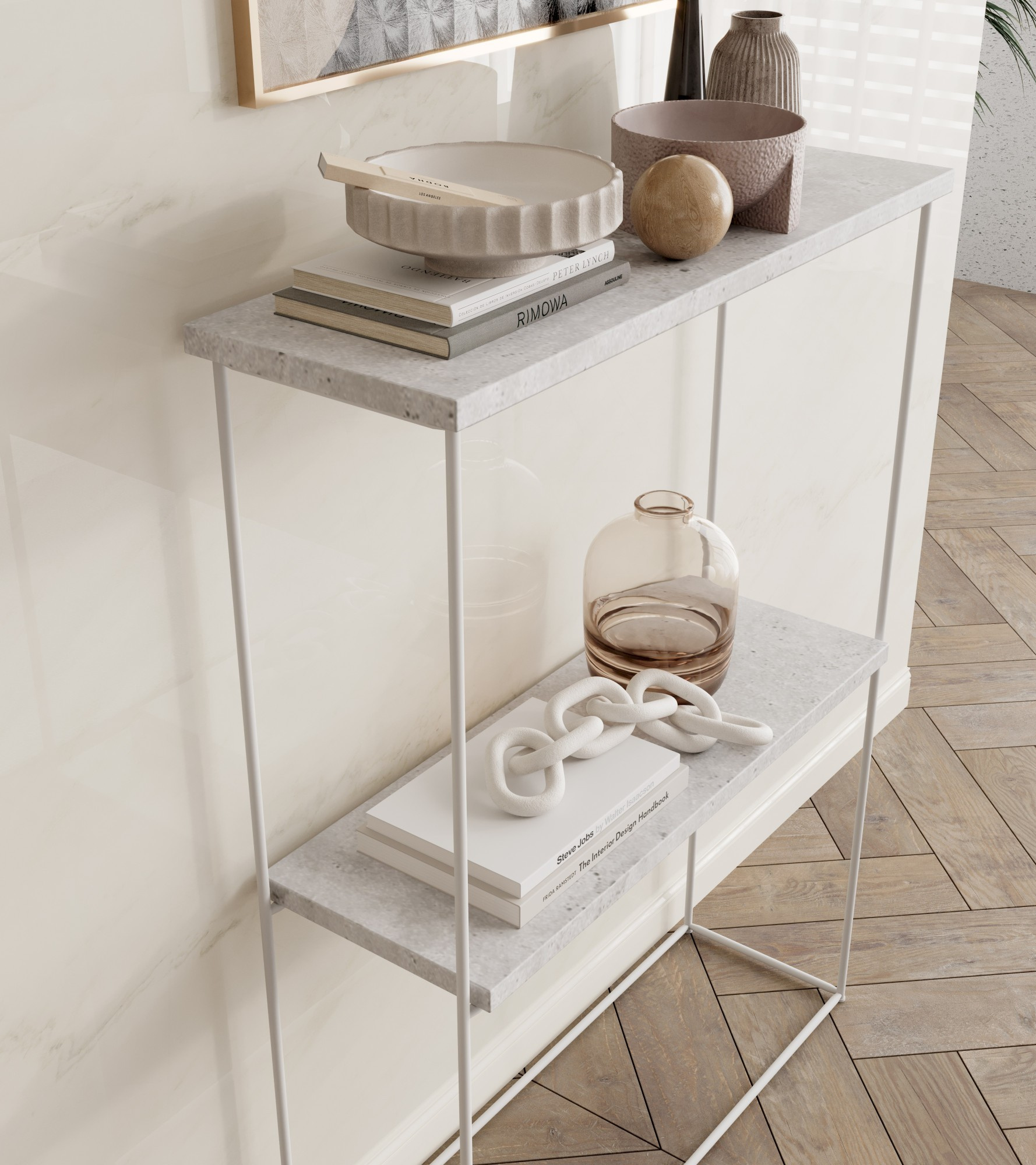 Konzola Velo z drátu je elegantní a moderní prvek vybavení interiéru, který se vyznačuje minimalistickým designem a vysokou funkčností. Konzola Velo z drátu je funkční a stylový nábytek, který jistě dodá kouzlo každému interiéru, zároveň nabízí praktická řešení pro ukládání a vystavování předmětů.