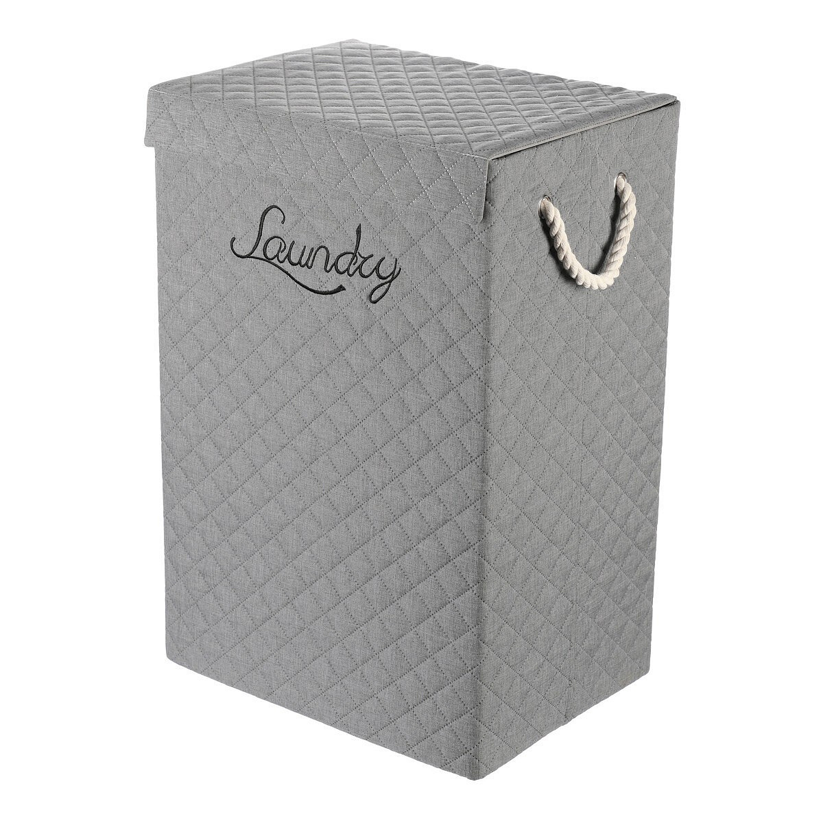 Vysoký látkový koš v šedém odstínu ve tvaru krabice s uchy z provázků a víkem, navíc potažený hebkou látkou, bude skvělou volbou pro každou domácnost. Praktický a stylový prostředek k tomu, jak efektivně schovat prádlo a zároveň přidat do prostoru na oko příjemný dekorační prvek.
