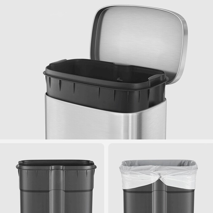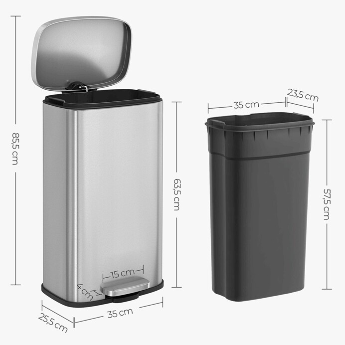 Odpadkový koš s objemem 30 litrů je vyroben z nerezového kovu v elegantním stříbrném provedení, které snadno zapadne do moderních i klasických interiérů. Praktický pedál umožňuje hygienické otevírání víka bez použití rukou, což zvyšuje komfort a čistotu při používání. Koš má stabilní základnu s protiskluzovou úpravou, která zajišťuje pevné postavení na podlaze. Jeho hladký povrch se snadno udržuje a odolává běžnému opotřebení, což přispívá k dlouhé životnosti produktu.