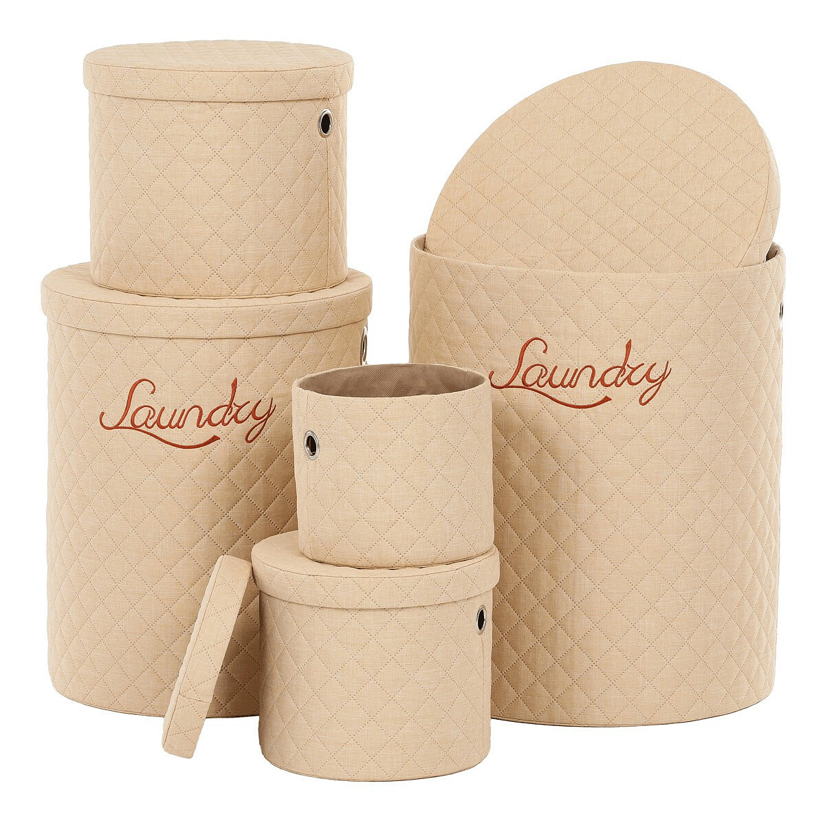 Sada pěti kulatých prádelních košů o různých velikostech v béžových barvách je ideálním pomocníkem do každé domácnosti. Všechny jsou potaženy hebkou látkou, což zajišťuje nejen elegantní vzhled, ale i příjemný dotek. Tyto koše pomohou v každé domácnosti efektivně uschovat prádlo, a zároveň udržet prostor čistý a uklizený.