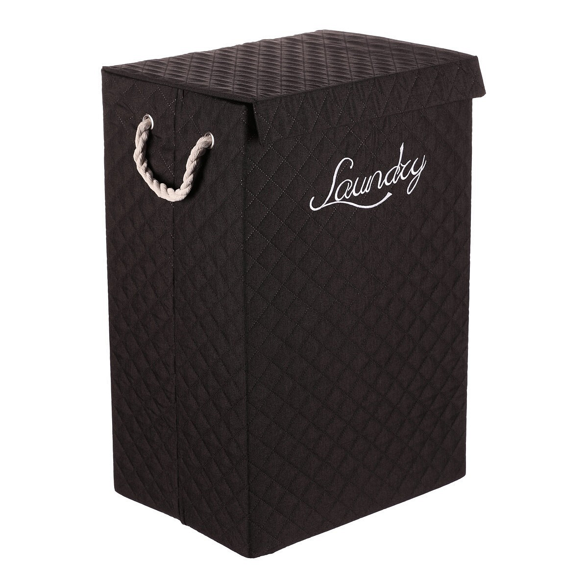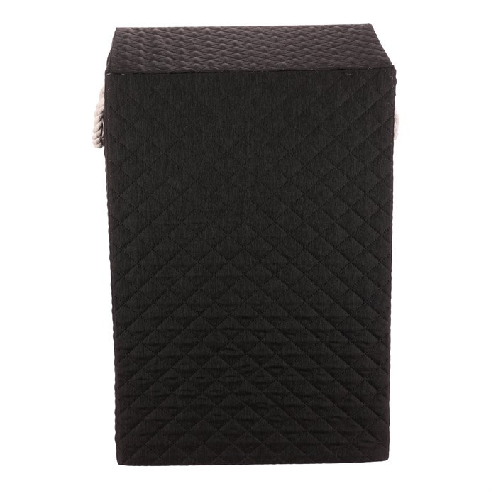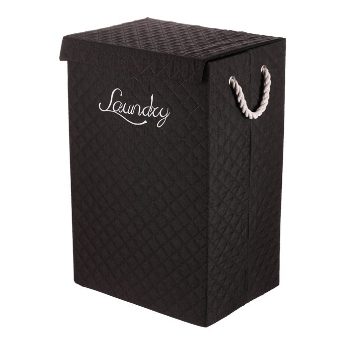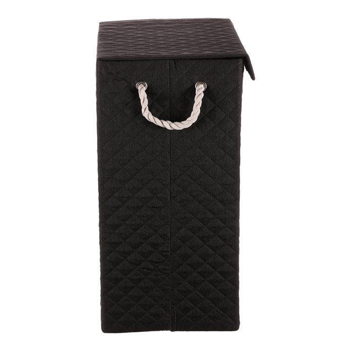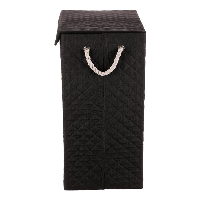 Vysoký látkový koš v černé barvě ve tvaru krabice s uchy z provázků a víkem, navíc potažený hebkou látkou, bude skvělou volbou pro každou domácnost. Praktický a stylový prostředek k tomu, jak efektivně schovat prádlo a zároveň přidat do prostoru na oko příjemný dekorační prvek.