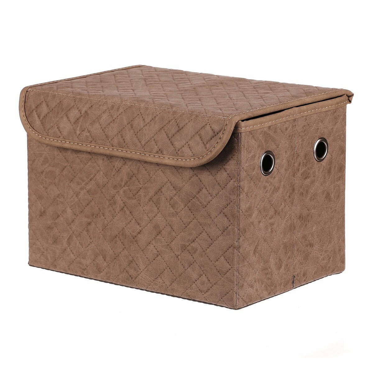 Elegantní látkový koš s víkem v hnědé barvě a obdélníkovém tvaru dodá vašemu úložnému prostoru styl i pořádek. Koženkový povrch působí vkusně a víko se zavírá jednoduše pomocí suchého zipu. Po bocích najdete praktické otvory pro ruce, které usnadňují přenášení. Ideální pro přehledné a vkusné uložení věcí v regálu nebo skříni.