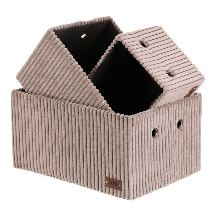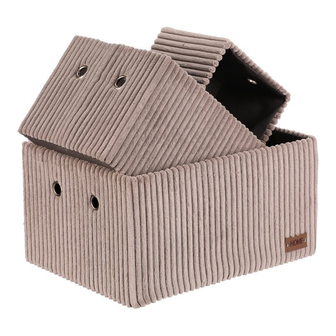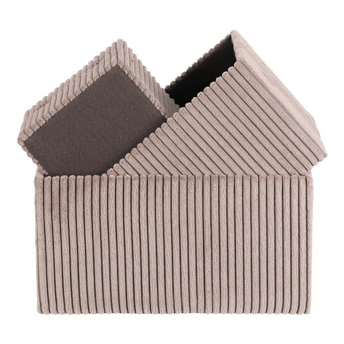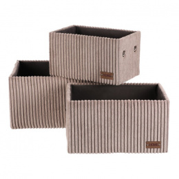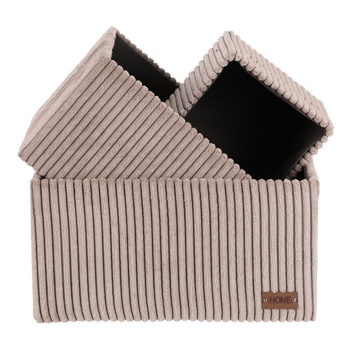 Sada tří látkových regálových košů o třech různých velikostech s manšestrovým potahem přinese do vaší domácnosti pořádek i styl. Obdélníkový tvar perfektně sedne do polic, povrch je příjemný na dotek a elegantní vzhled skvěle ladí s moderním interiérem. Ideální pro uschování oblečení a nejrůznějších věcí a drobností, které chcete mít přehledně a úhledně uložené.