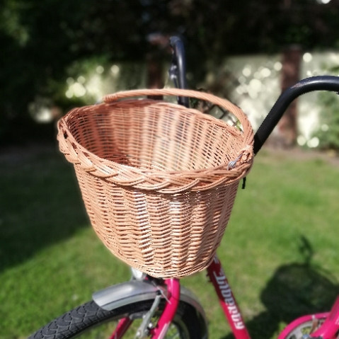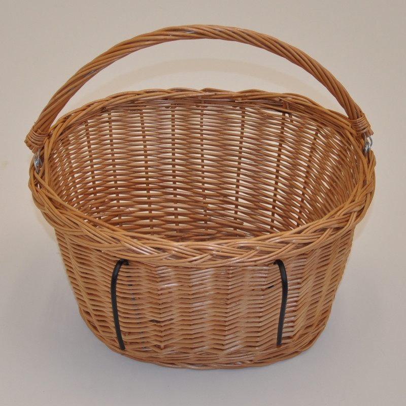 Košík na kolo z vrbového proutí. | Univerzální košík určený na zavěšení na řidítka jízdního kola. Košík se zavěšuje na kolo pomocí dvou silných ocelových drátů, které jsou již pevně zapleteny ve výpletu košíku. Velikost košíku je 37x30x21 cm. Vzdálenost mezi závěsnými dráty je 15 cm.