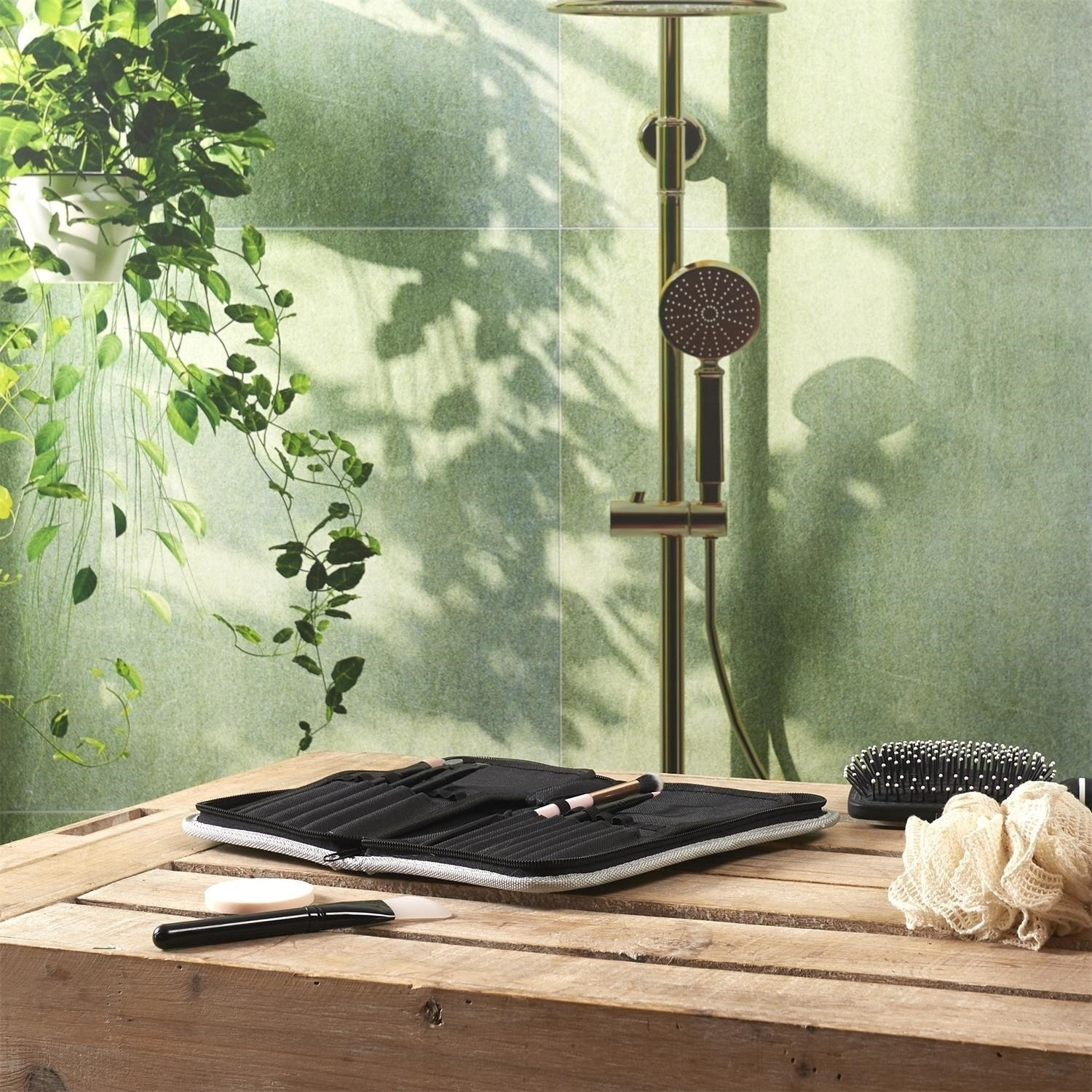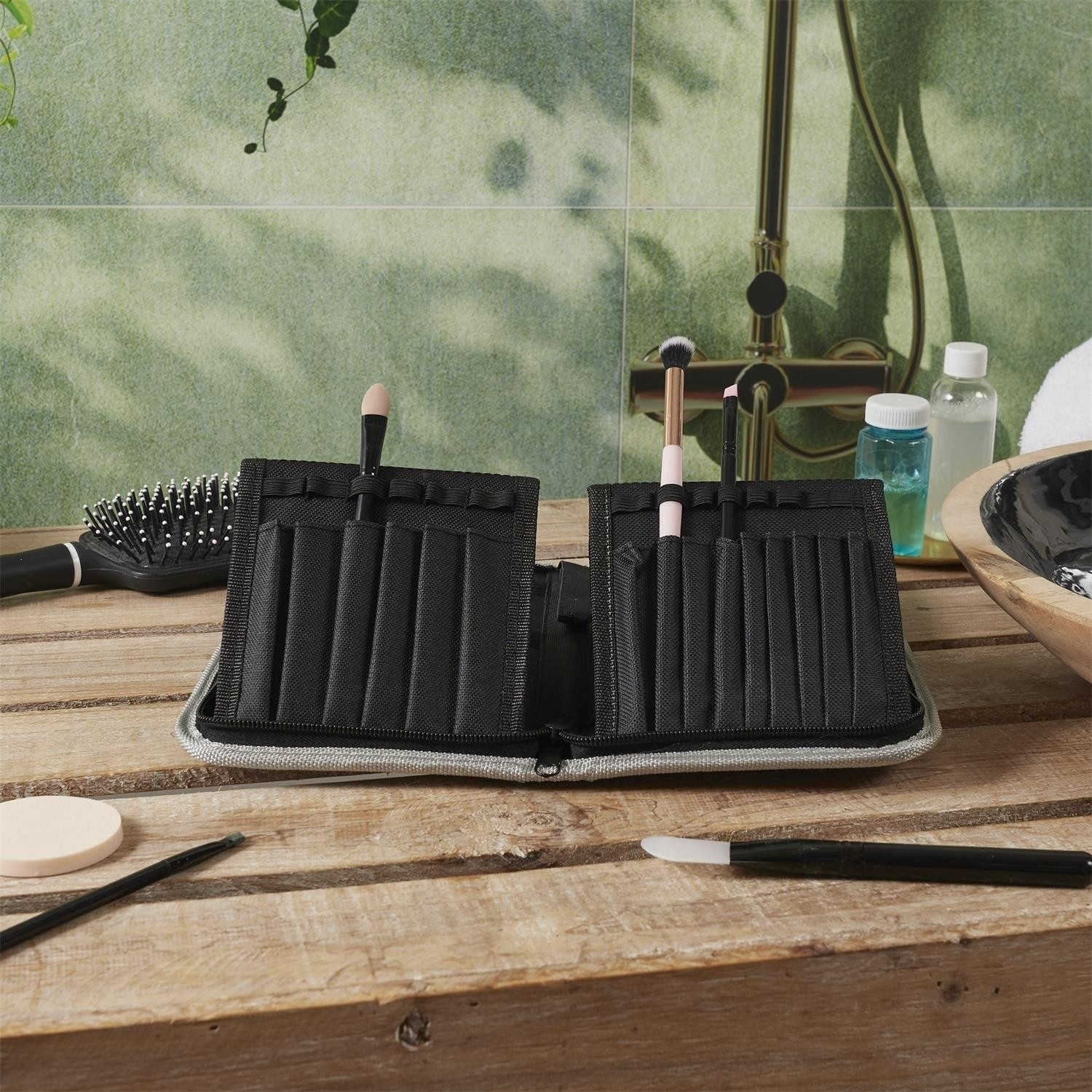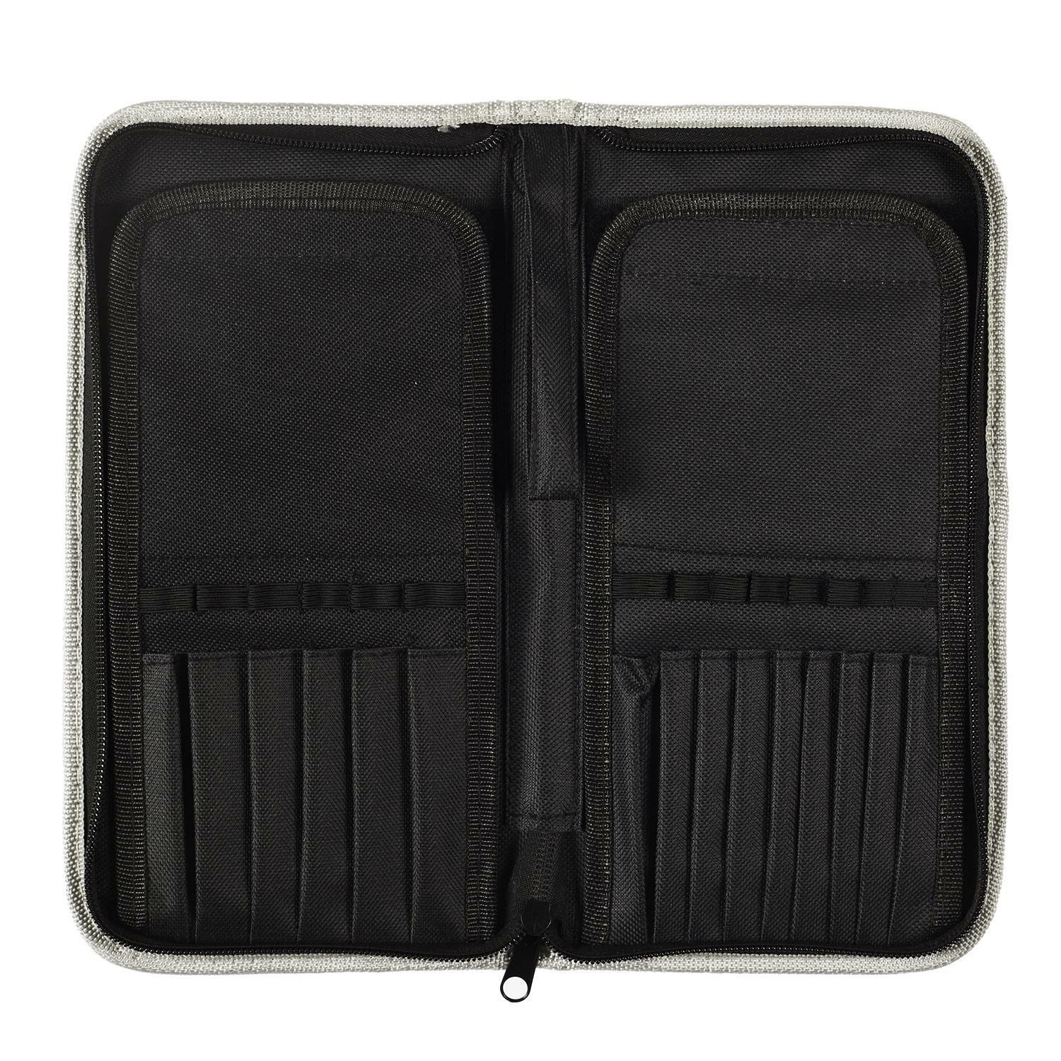 Praktická a elegantní šedá kosmetická taška na štětce, vybavená přihrádkami, které pomáhají udržet pořádek. Ideální pro ukládání štětců na make-up, zajišťuje jejich bezpečnost a snadný přístup. Lehká a praktická, ideální pro každodenní použití a cestování.