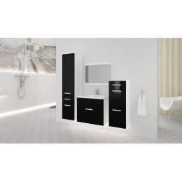 Moderní a jednoduchá koupelnová sestava, která splní svůj praktický i dekorativní účel. Sestava se skládá ze dvou závěsných skříněk, zrcadla a skříňky pod umyvadlo včetně umyvadla. Koupelnová sestava má plastové úchyty v šedé barvě. Dvířka jsou vyrobena v lesku z lamina tloušťky 16 mm v černé barvě, korpusy jsou v bílém provedení MAT tloušťky lamina 18 mm. Zboží je dodáváno v demontu se schematickým návodem k montáži. Vyobrazené dekorace nejsou v ceně sestavy. Sestavu nabízíme také v dalších barevných provedeních, které jsou k vidění na vedlejších fotografiích.