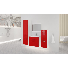 Moderní a jednoduchá koupelnová sestava, která splní svůj praktický i dekorativní účel. Sestava se skládá ze dvou závěsných skříněk, zrcadla a skříňky pod umyvadlo včetně umyvadla. Koupelnová sestava má plastové úchyty v šedé barvě. Dvířka jsou vyrobena v lesku z lamina tloušťky 16 mm v červené barvě, korpusy jsou v bílém provedení MAT tloušťky lamina 18 mm. Zboží je dodáváno v demontu se schematickým návodem k montáži. Vyobrazené dekorace nejsou v ceně sestavy. Sestavu nabízíme také v dalších barevných provedeních, které jsou k vidění na vedlejších fotografiích.