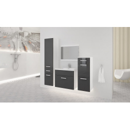 Moderní a jednoduchá koupelnová sestava, která splní svůj praktický i dekorativní účel. Sestava se skládá ze dvou závěsných skříněk, zrcadla a skříňky pod umyvadlo včetně umyvadla. Koupelnová sestava má plastové úchyty v šedé barvě. Dvířka jsou vyrobena v lesku z lamina tloušťky 16 mm v šedé barvě, korpusy jsou v bílém provedení MAT tloušťky lamina 18 mm. Zboží je dodáváno v demontu se schematickým návodem k montáži. Vyobrazené dekorace nejsou v ceně sestavy. Sestavu nabízíme také v dalších barevných provedeních, které jsou k vidění na vedlejších fotografiích.