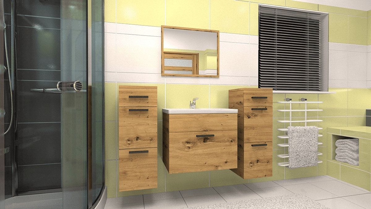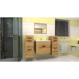 Moderní a jednoduchá koupelnová sestava, která splní svůj praktický i dekorativní účel. Sestava se skládá ze dvou závěsných skříněk, zrcadla a skříňky pod umyvadlo včetně umyvadla. Koupelnová sestava má plastové úchyty v černé barvě. Sestava je vyrobena z lamina tloušťky 18 mm v dekóru dub artisan. Zboží je dodáváno v demontu se schematickým návodem k montáži.