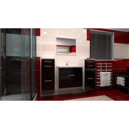 Moderní a jednoduchá koupelnová sestava, která splní svůj praktický i dekorativní účel. Sestava se skládá ze dvou závěsných skříněk, zrcadla a skříňky pod umyvadlo včetně umyvadla. Koupelnová sestava má plastové úchyty v šedé barvě. Dvířka jsou vyrobena v lesku z lamina tloušťky 16 mm v černé barvě, korpusy jsou v bílém provedení MAT tloušťky lamina 18 mm. Zboží je dodáváno v demontu se schematickým návodem k montáži. Vyobrazené dekorace nejsou v ceně sestavy. Sestavu nabízíme také v dalších barevných provedeních, které jsou k vidění na vedlejších fotografiích.