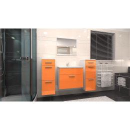 Moderní a jednoduchá koupelnová sestava, která splní svůj praktický i dekorativní účel. Sestava se skládá ze dvou závěsných skříněk, zrcadla a skříňky pod umyvadlo včetně umyvadla. Koupelnová sestava má plastové úchyty v šedé barvě. Dvířka jsou vyrobena v lesku z lamina tloušťky 16 mm v oranžové barvě, korpusy jsou v bílém provedení MAT tloušťky lamina 18 mm. Zboží je dodáváno v demontu se schematickým návodem k montáži. Vyobrazené dekorace nejsou v ceně sestavy. Sestavu nabízíme také v dalších barevných provedeních, které jsou k vidění na vedlejších fotografiích.