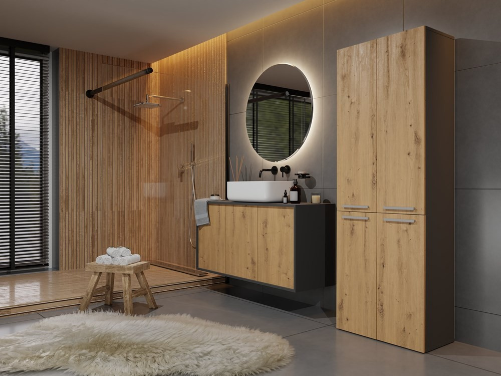 Stylová skříňka Noeli vám díky praktickému úložnému prostoru pomůže vytvořit dokonale organizovanou a útulnou koupelnu. Nadčasový design splní očekávání všech, kteří oceňují kombinaci jednoduchosti a elegance. Skříňka je vyrobená ze snadno udržovatelného lamina, hrany jsou povrchově upravené ABS plastem (vyznačuje se vysokou mechanickou a chemickou odolností).