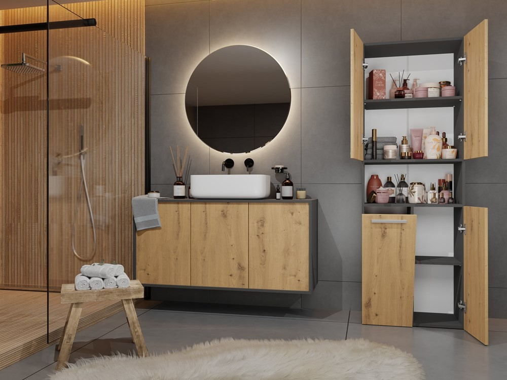 Stylová skříňka Noeli vám díky praktickému úložnému prostoru pomůže vytvořit dokonale organizovanou a útulnou koupelnu. Nadčasový design splní očekávání všech, kteří oceňují kombinaci jednoduchosti a elegance. Skříňka je vyrobená ze snadno udržovatelného lamina, hrany jsou povrchově upravené ABS plastem (vyznačuje se vysokou mechanickou a chemickou odolností).