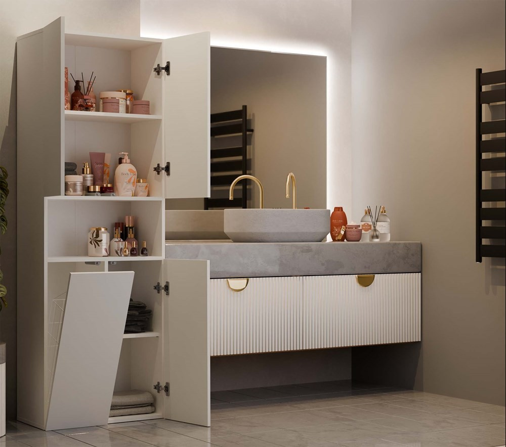 Stylová skříňka Noeli vám díky praktickému úložnému prostoru pomůže vytvořit dokonale organizovanou a útulnou koupelnu. Nadčasový design splní očekávání všech, kteří oceňují kombinaci jednoduchosti a elegance. Skříňka je vyrobená ze snadno udržovatelného lamina, hrany jsou povrchově upravené ABS plastem (vyznačuje se vysokou mechanickou a chemickou odolností). Systém TIP-ON - dvířka se otevírají po jemném zatlačení na čelo dvířek.