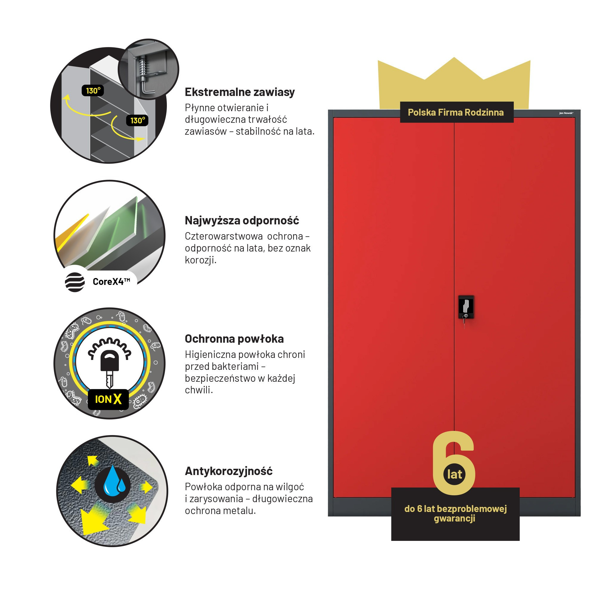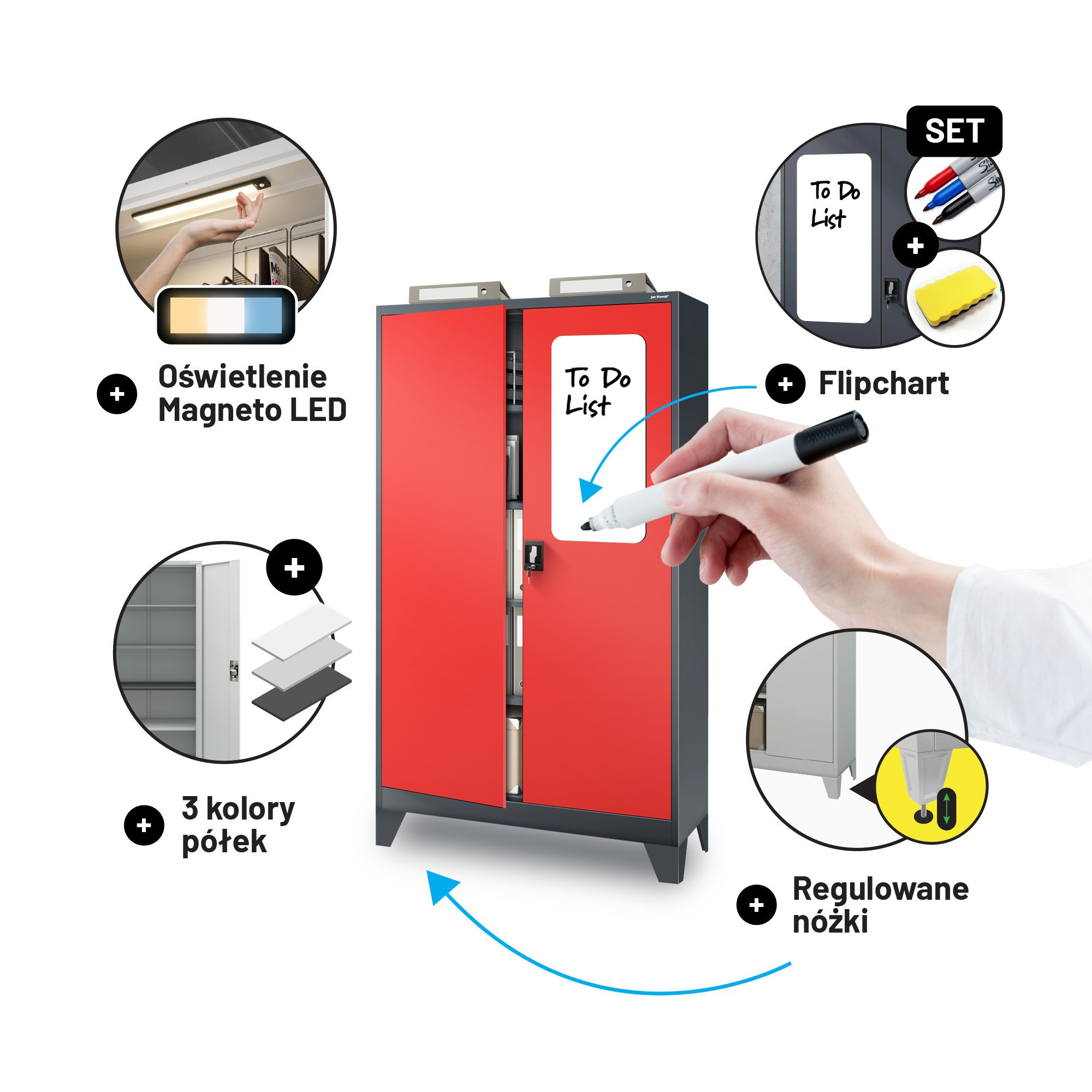 Kancelářská skříň JAN II – antracitově-červená je dokonalou kombinací funkčnosti, odolnosti a designu. Je to investice, která se vám vyplatí, protože získáte spolehlivý úložný prostor, který vám bude sloužit po mnoho let. Objednejte si ji ještě dnes a užijte si pořádek a styl ve vaší kanceláři, dílně nebo doma!