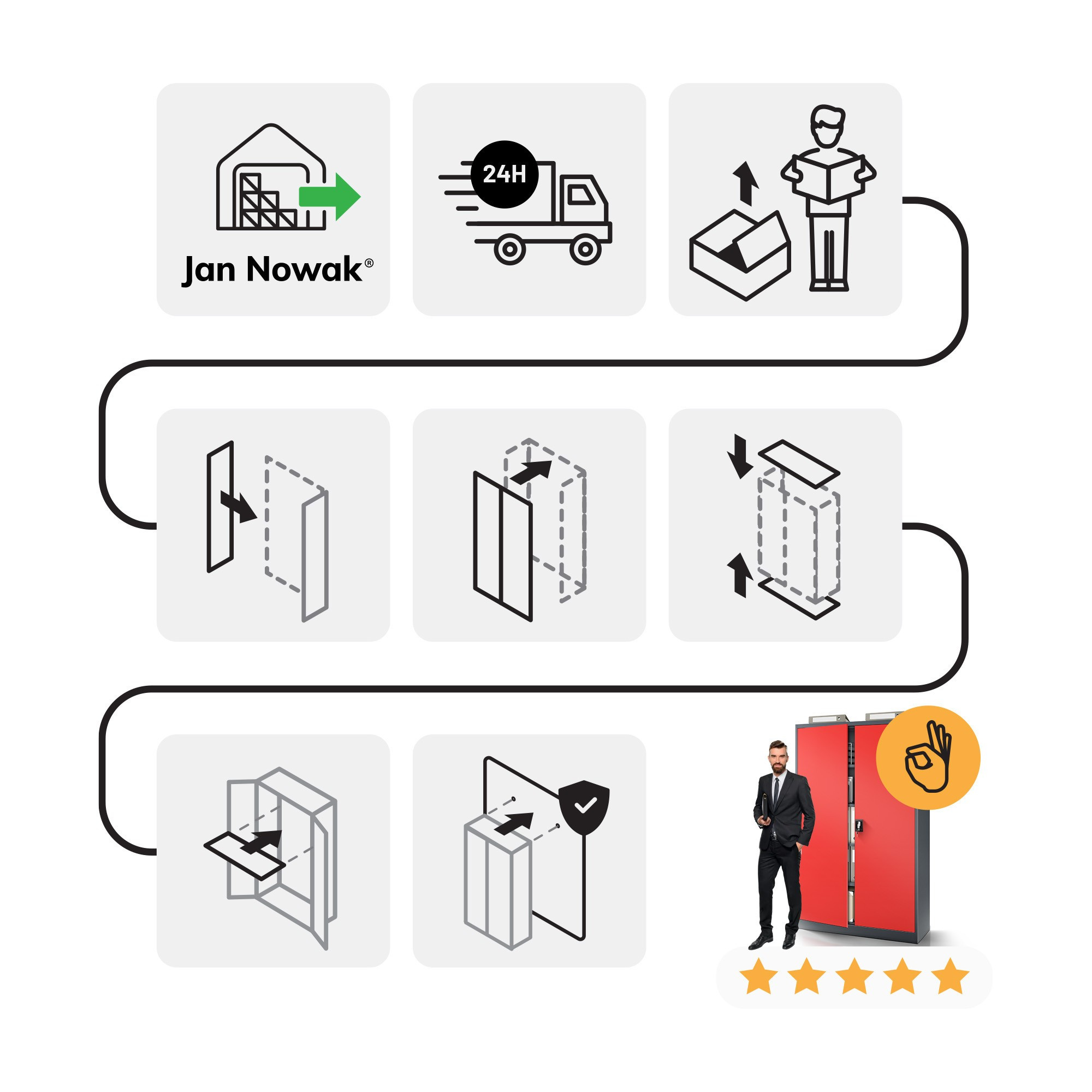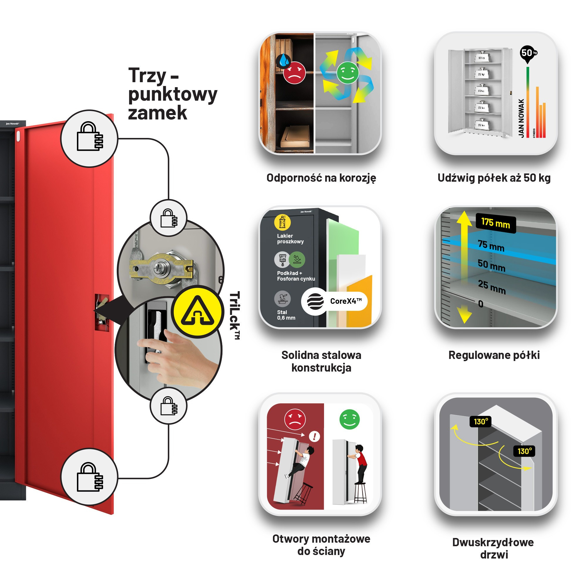 Skříň JAN II je navržena s důrazem na každý detail. Práškové lakování zajišťuje nejen odolnost, ale i estetický vzhled. Nastavitelné police vám umožní optimalizovat vnitřní prostor podle vašich potřeb. Uzamykatelný zámek se 3 body uzamčení poskytuje vysokou úroveň zabezpečení. A robustní konstrukce zaručuje dlouhou životnost.