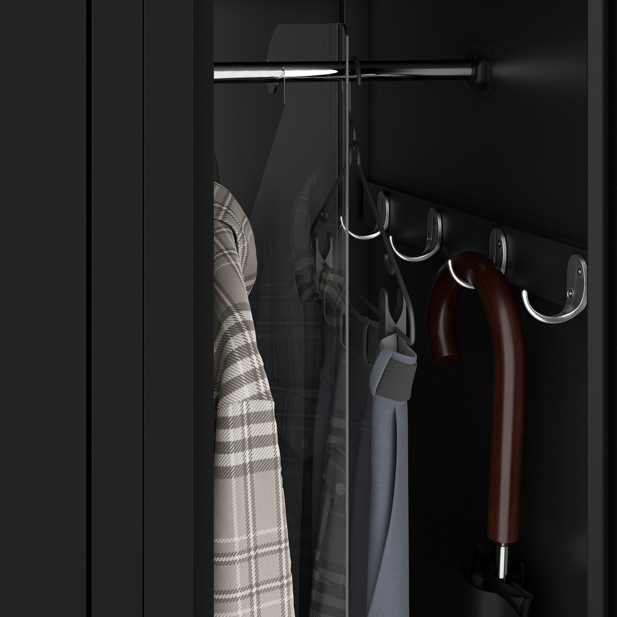 - Optimální využití prostoru: Dvě prostorné komory s tyčí na ramínka umožňují pohodlné ukládání oděvů bez pomačkání. Dvě horní police poskytují dostatek místa pro tašky, batohy a další osobní věci. Dodatečné háčky usnadňují rychlý přístup k často používaným předmětům.