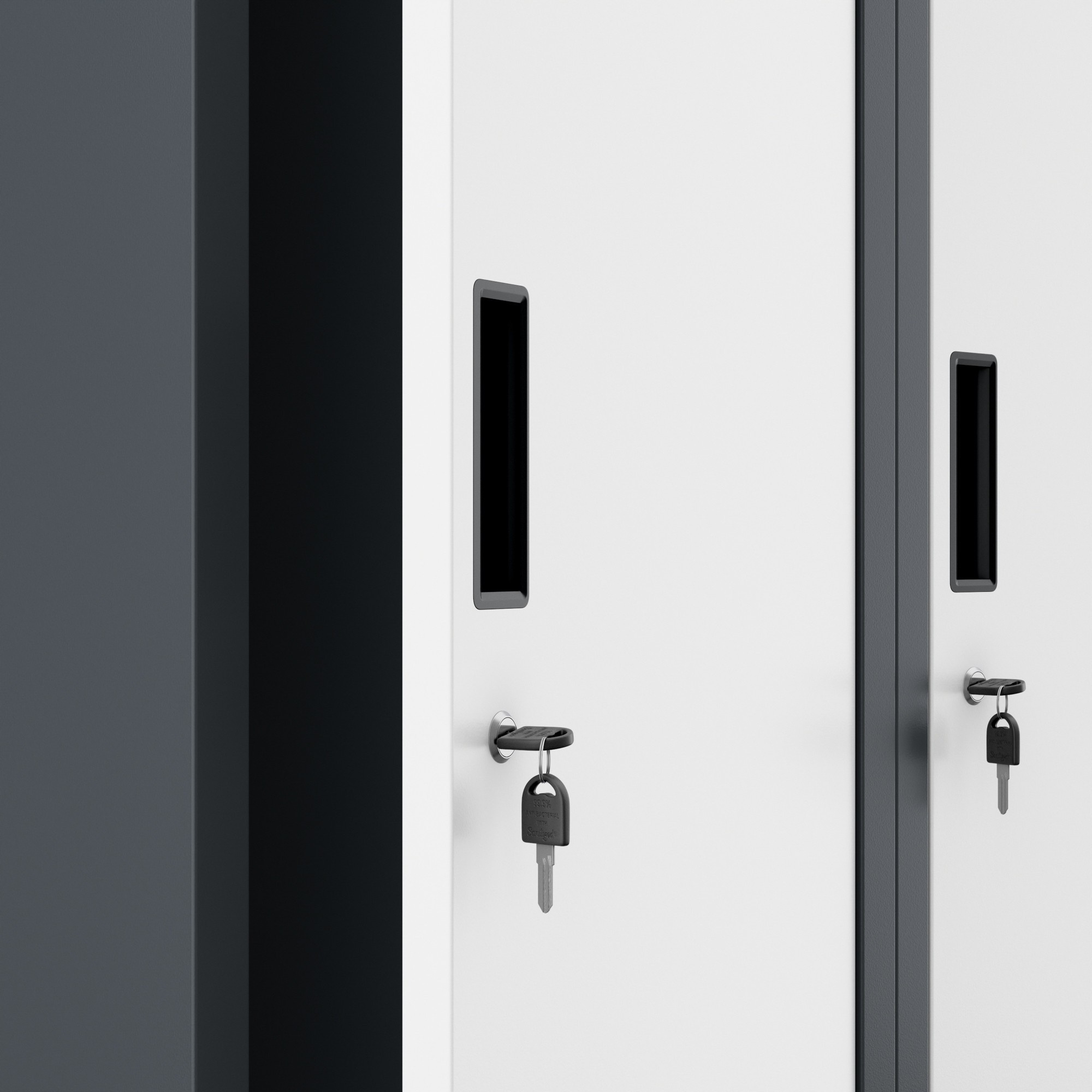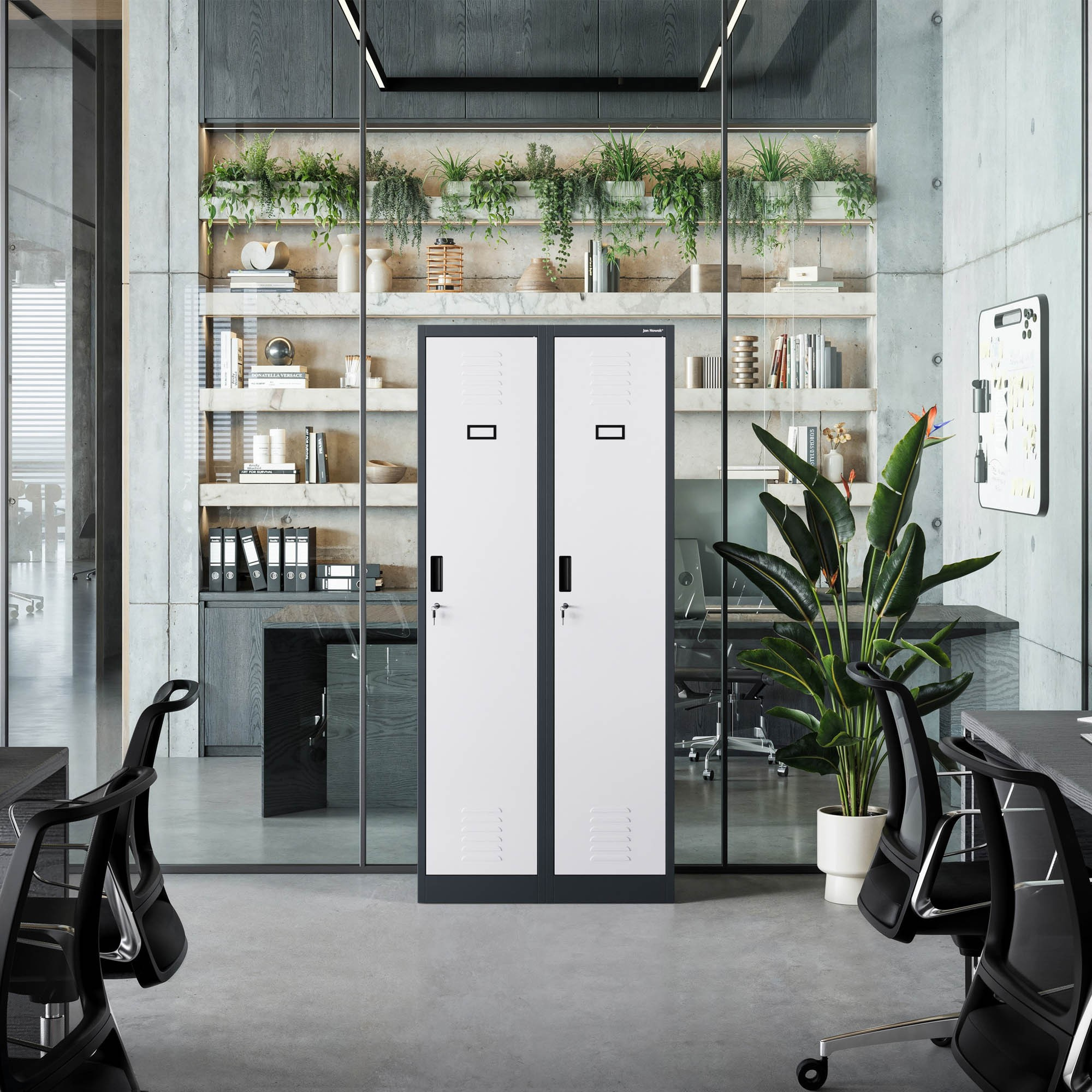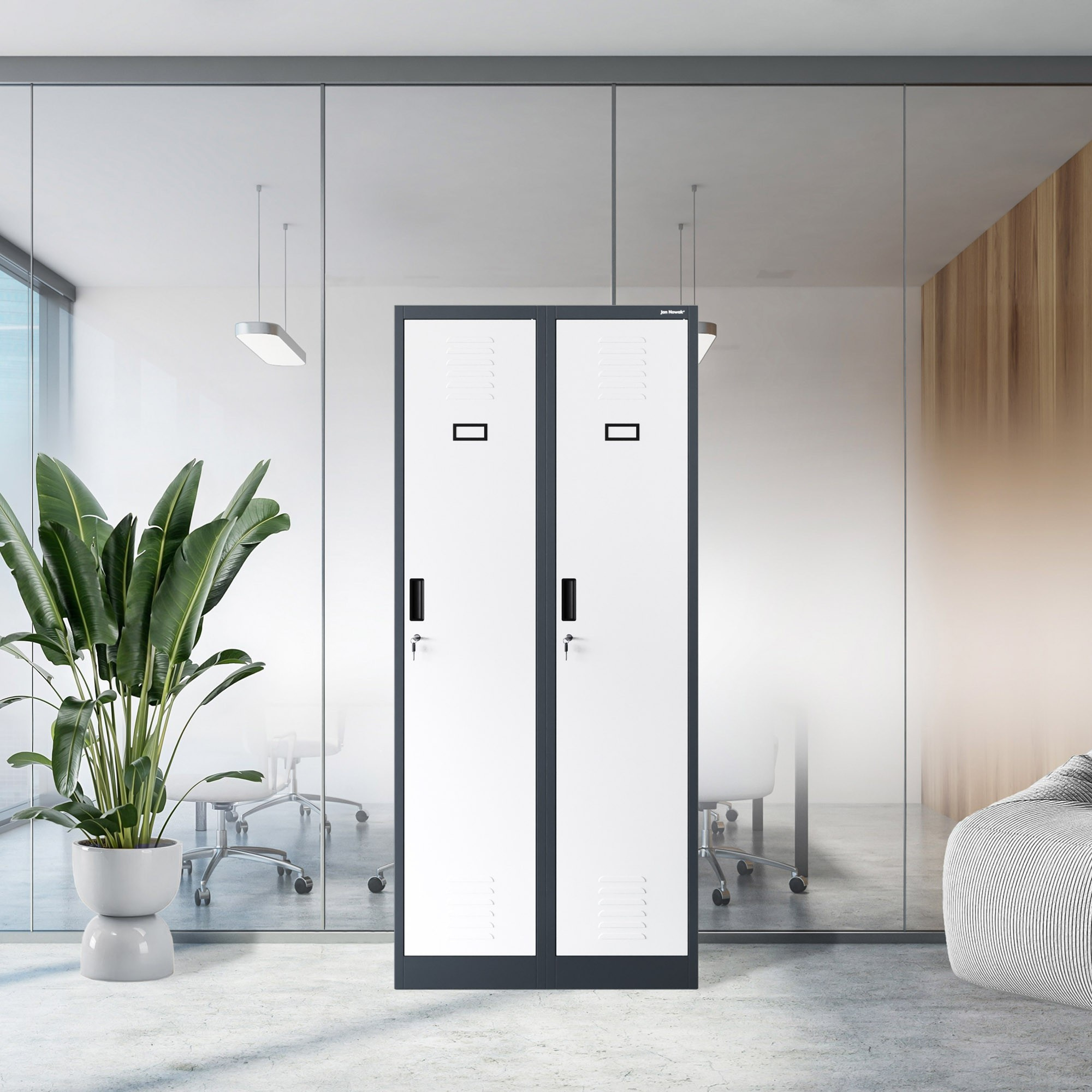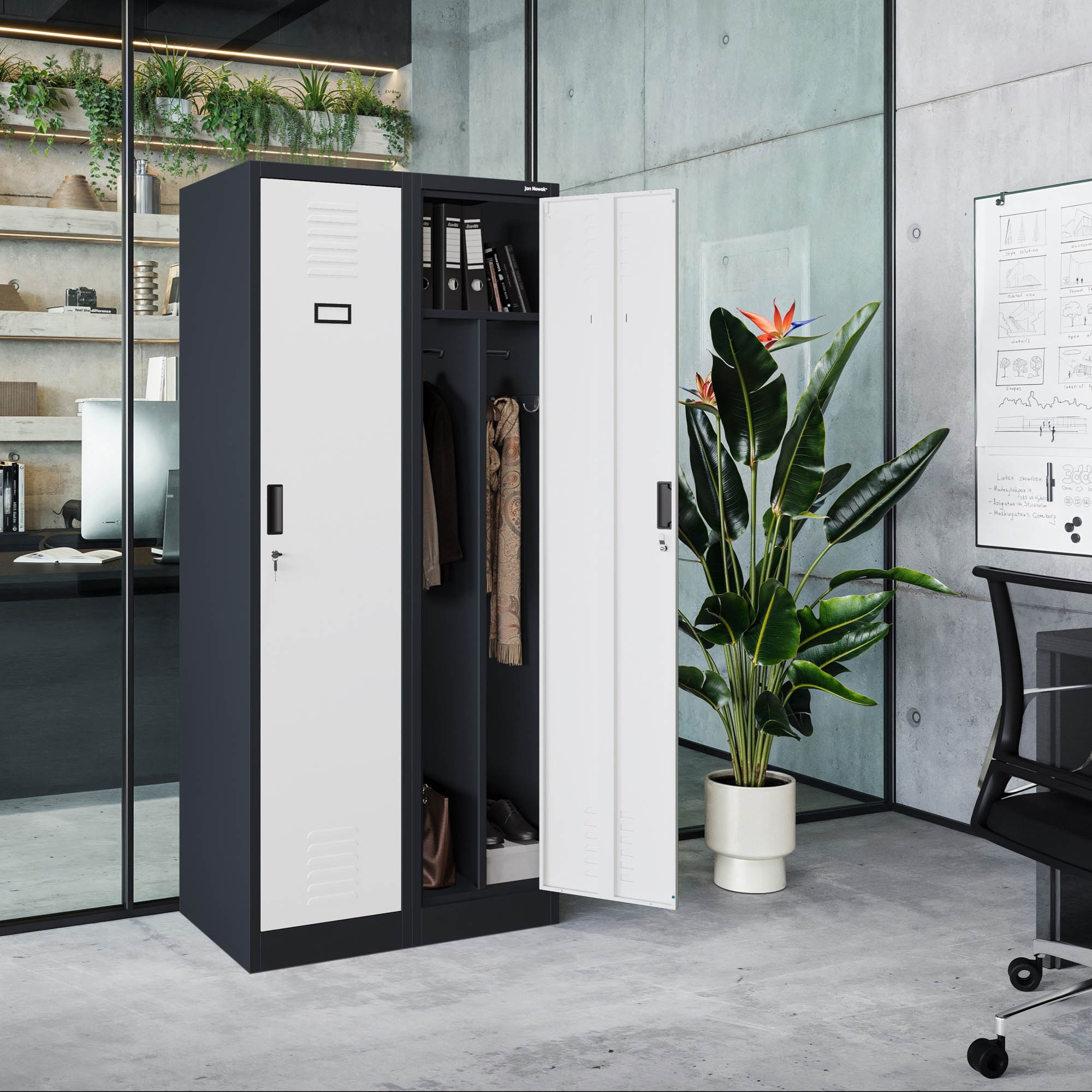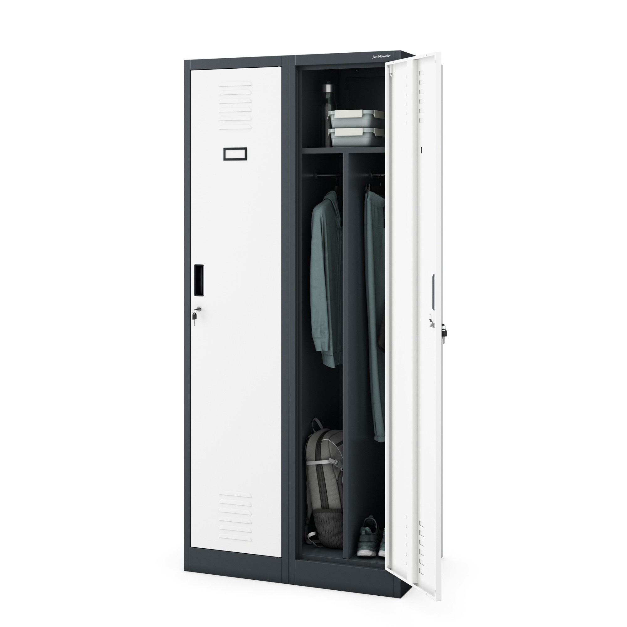 Dvoukřídlé dveře s robustním zámkem zaručují maximální bezpečnost uložených předmětů. Mějte jistotu, že vaše věci jsou v bezpečí.