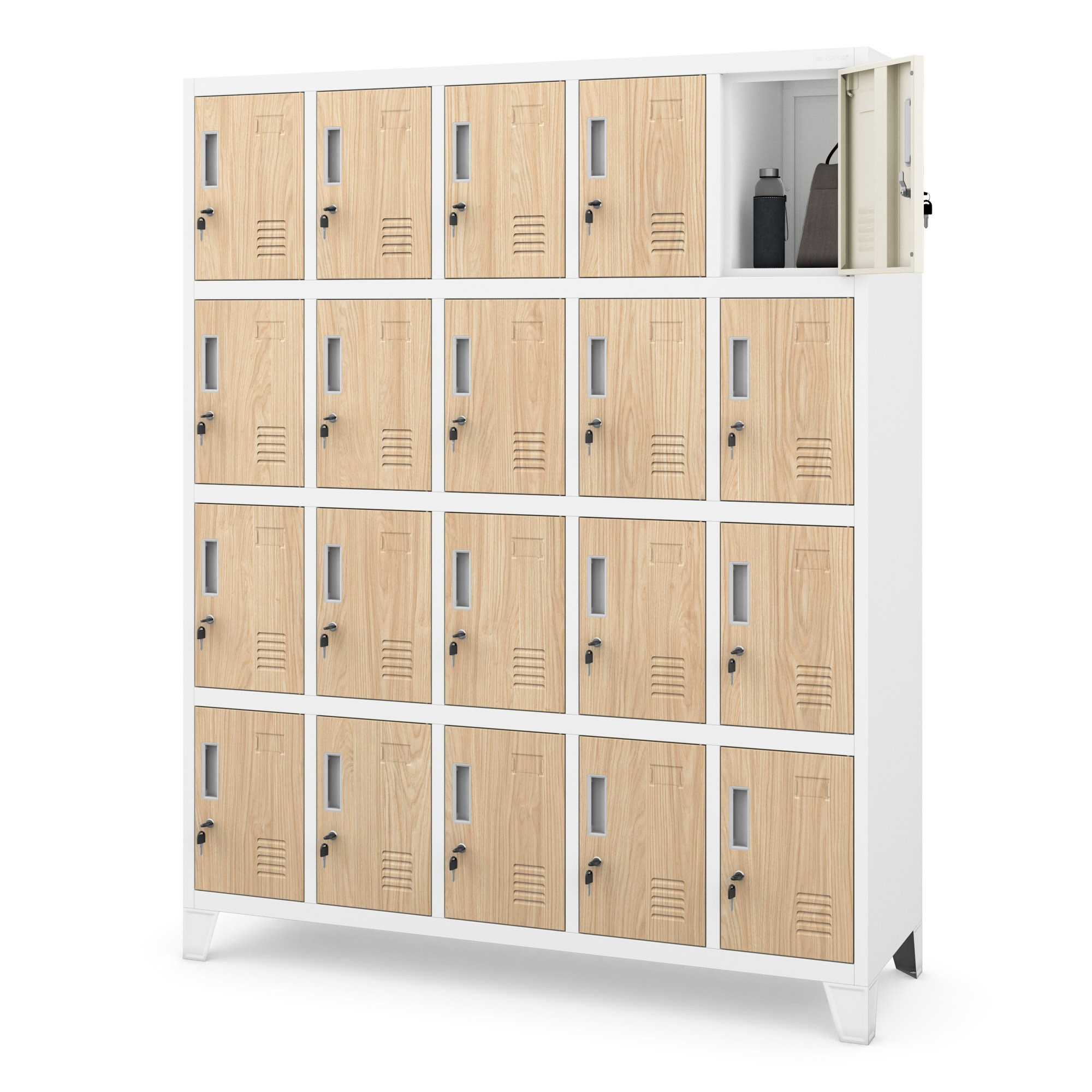Každá přihrádka je vybavena jednobodovým zámkem, který zajišťuje bezpečné uložení osobních věcí. Zámek chrání obsah přihrádky před neoprávněným přístupem a dává uživatelům jistotu, že jejich věci jsou v bezpečí.
