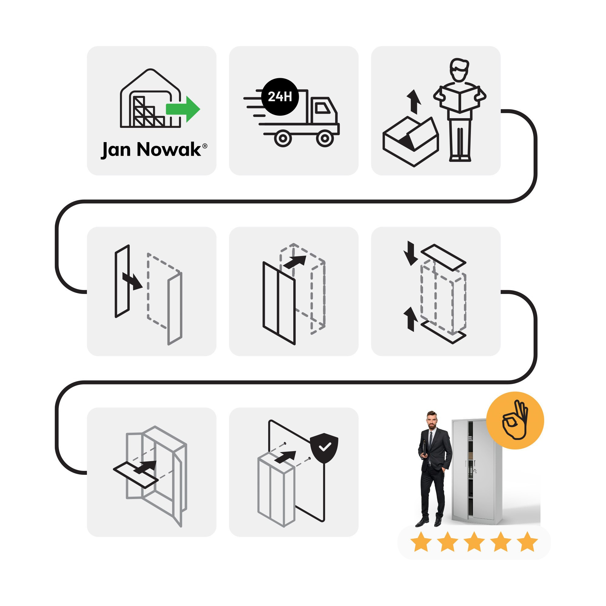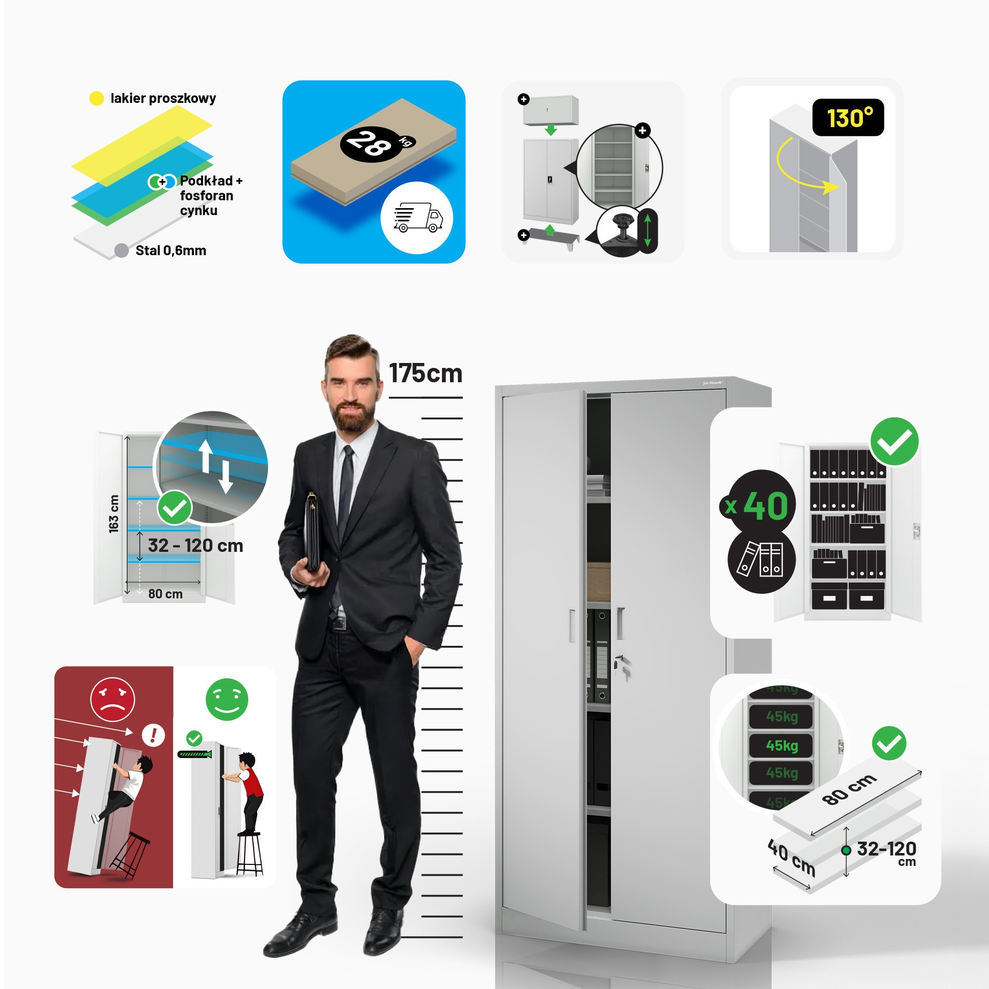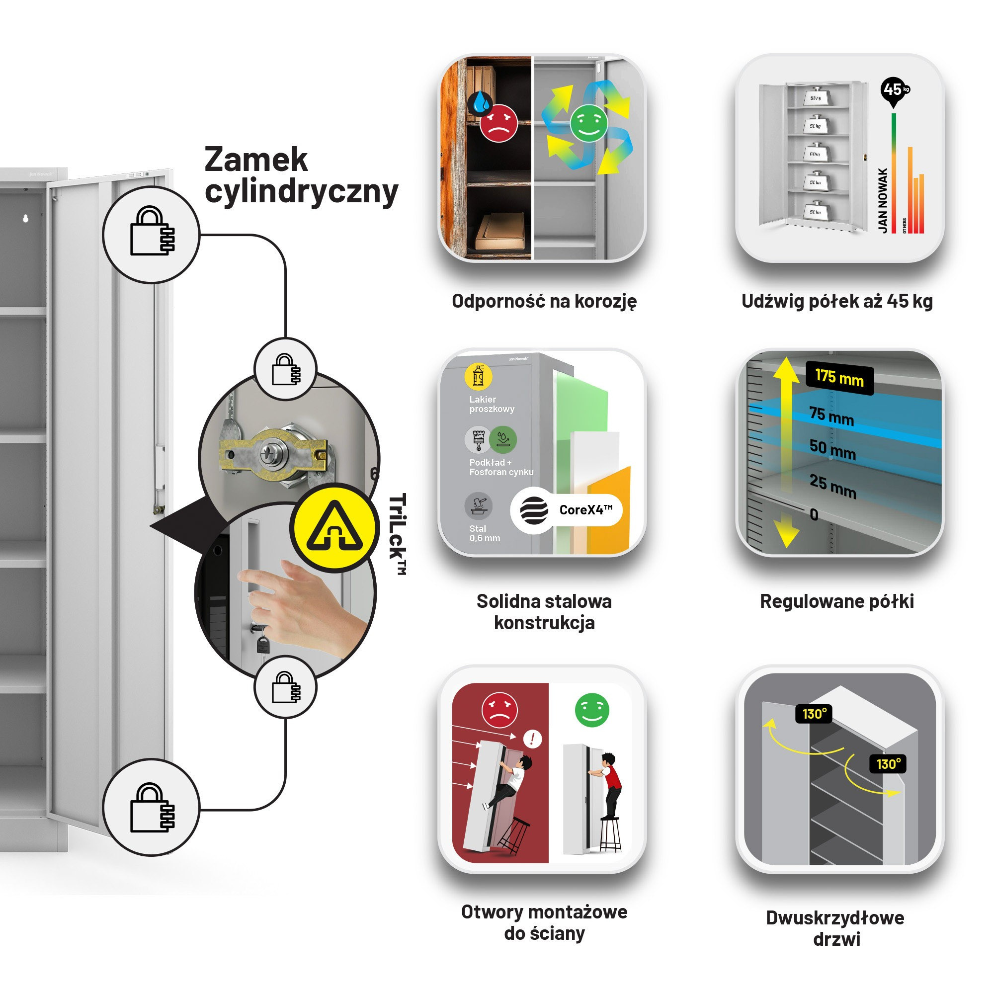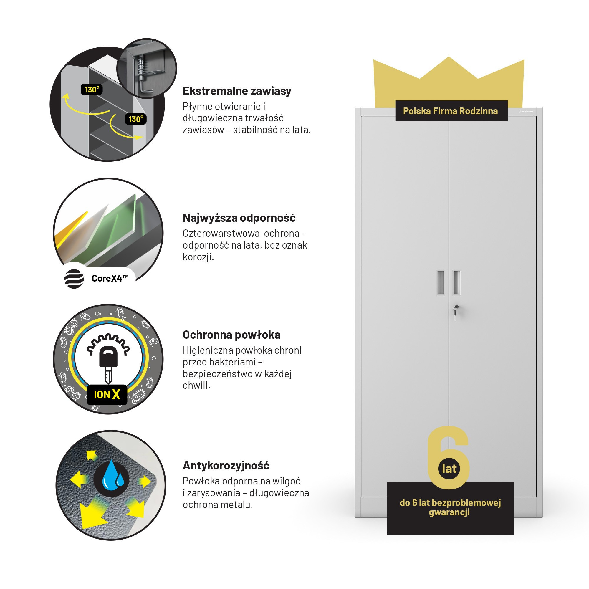 Základem skříně JAN Compact je kvalitní ocelový plech o tloušťce 0,6 mm. Tato robustní konstrukce zajišťuje vysokou odolnost proti mechanickému poškození a deformacím. Nemusíte se obávat, že by se skříň prohnula pod tíhou uložených předmětů nebo že by ji poškodilo běžné opotřebení. Práškové lakování povrchu navíc chrání skříň před korozí a poškrábáním, takže si i po letech používání zachová svůj profesionální vzhled.