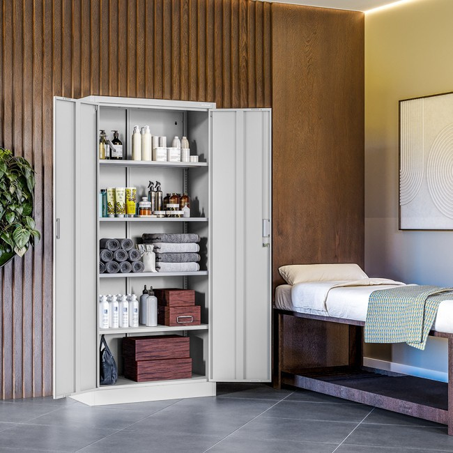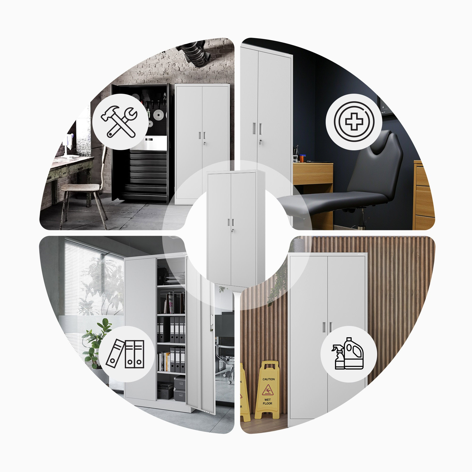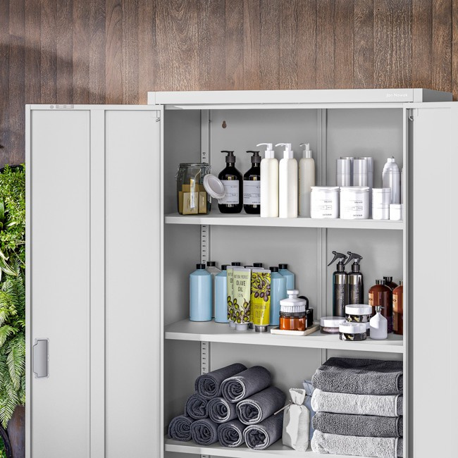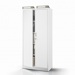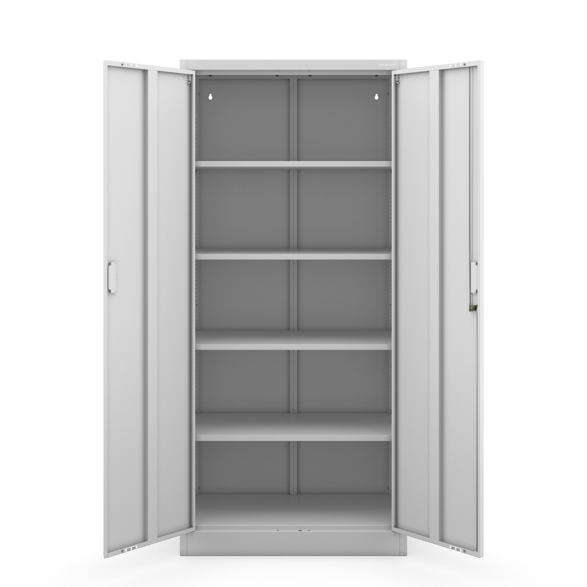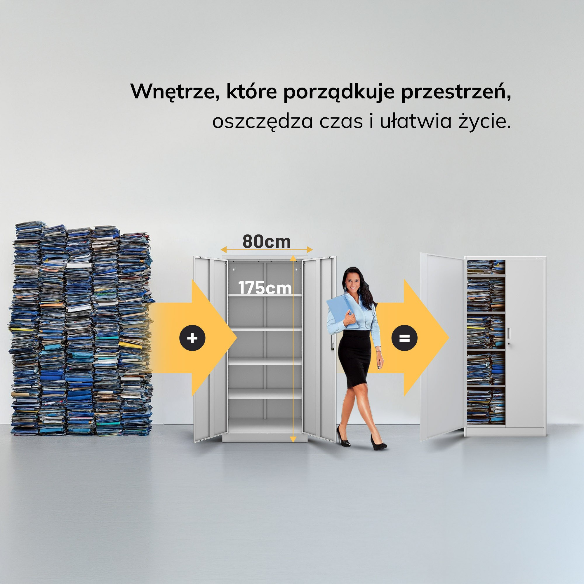Vnitřní prostor skříně JAN Compact je vybaven 4 policemi s nastavitelnou výškou. Díky tomu si můžete uspořádání polic přizpůsobit přesně podle svých potřeb a ukládat předměty různých velikostí a tvarů. Ať už potřebujete uložit šanony s dokumenty, knihy, nářadí, oblečení nebo kancelářské potřeby, v skříni JAN Compact pro ně vždy najdete to správné místo.