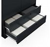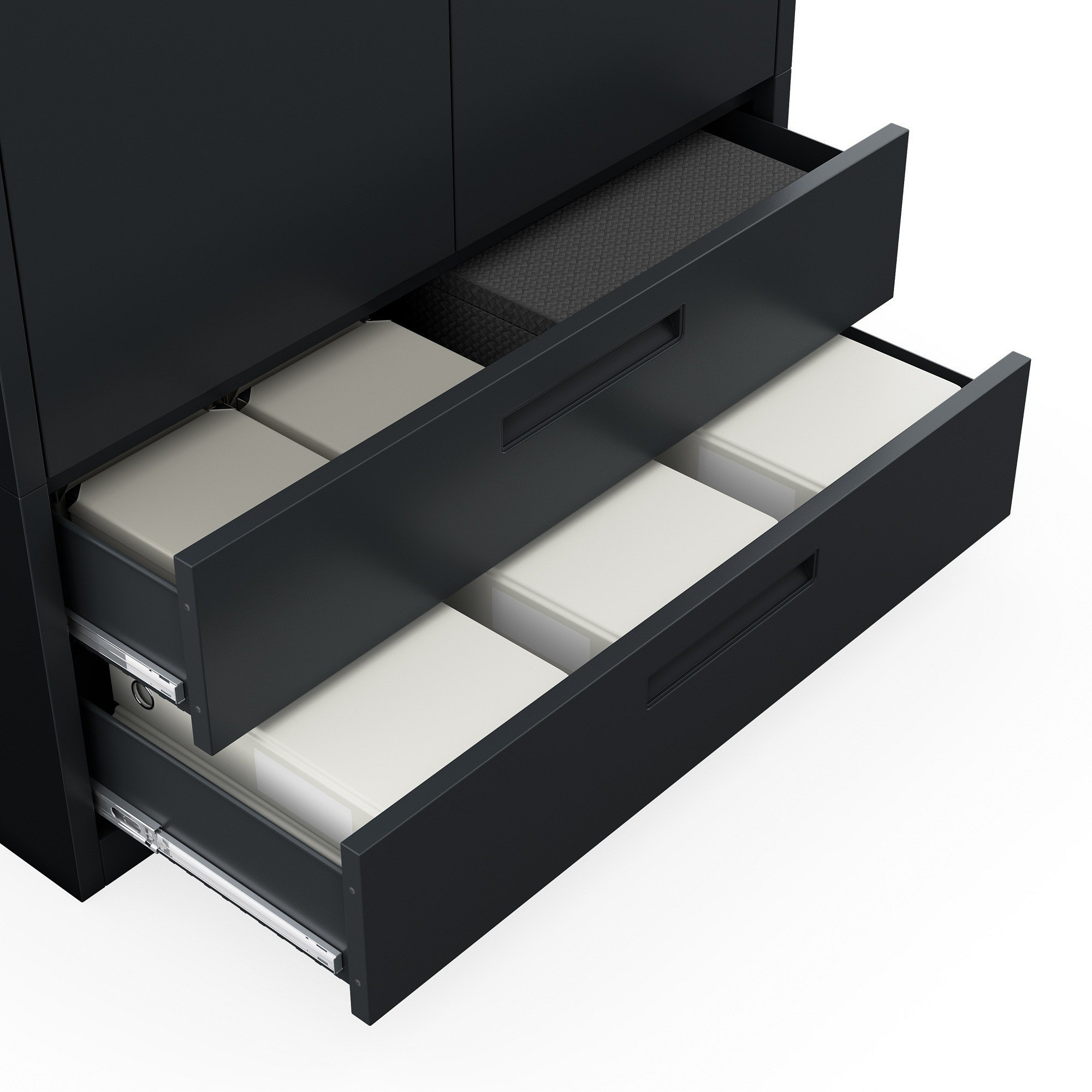 Zásuvky fungují na tichých kuličkových pojezdech s plným výsuvem, což zajišťuje plynulý a bezproblémový chod. Kromě zvětšeného úložného prostoru se kovová skříň s dvojitou zásuvkou pevně drží podlahy a nekýve se, což zaručuje maximální stabilitu a bezpečnost.
