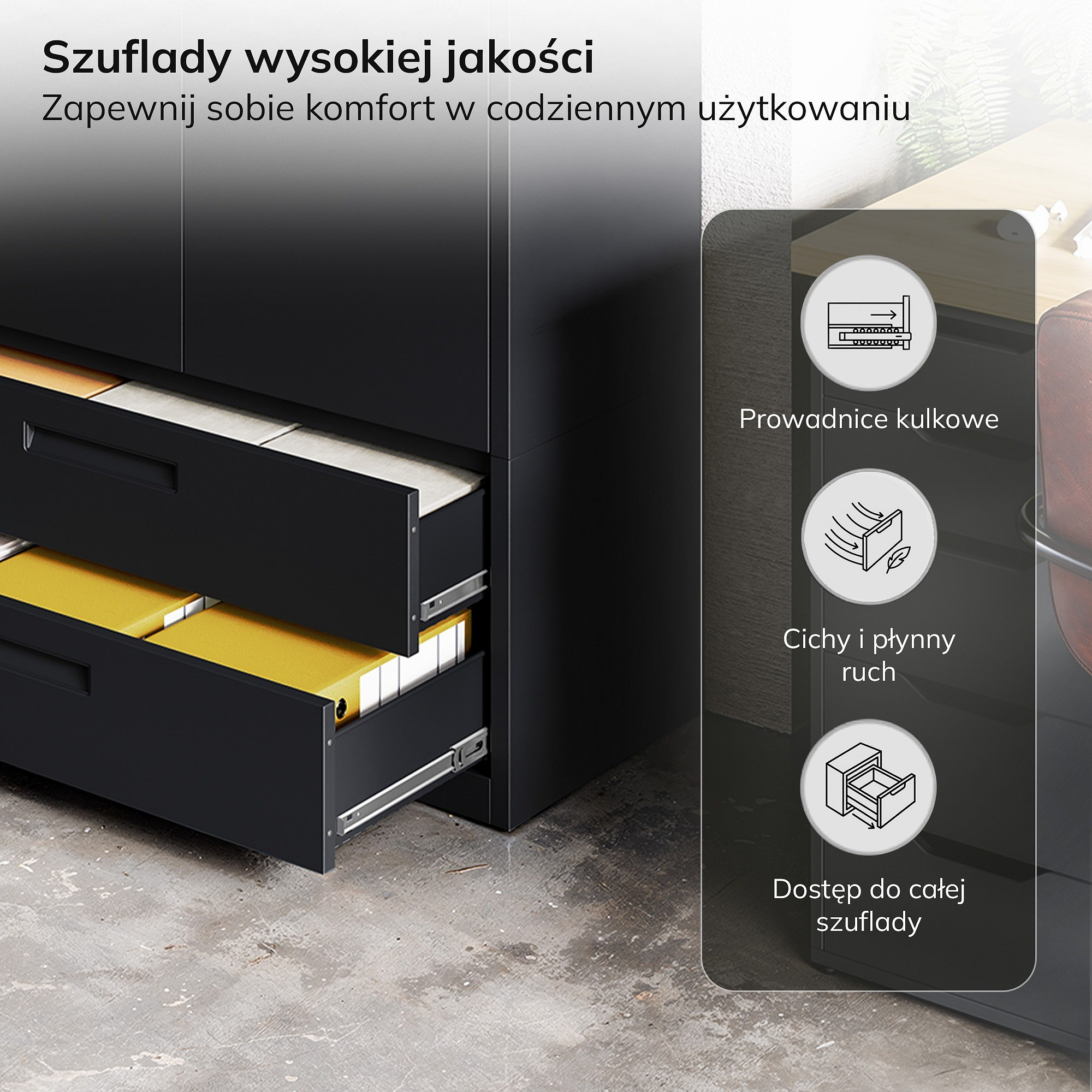 K modulární skříni MEGAN lze vybrat kompatibilní nízkou, vysokou nebo dvojitou zásuvku. Zásuvka na kuličkových pojezdech s plným výsuvem zajišťuje tichý a plynulý pohyb a přístup k celému vnitřku. Nabízí dodatečný úložný prostor a rozděluje skříň na dvě úložné zóny – otevřenou a uzavřenou, což zlepšuje organizaci. Uložte si do zásuvky drobné nářadí, kancelářské potřeby nebo osobní věci a mějte je vždy po ruce.