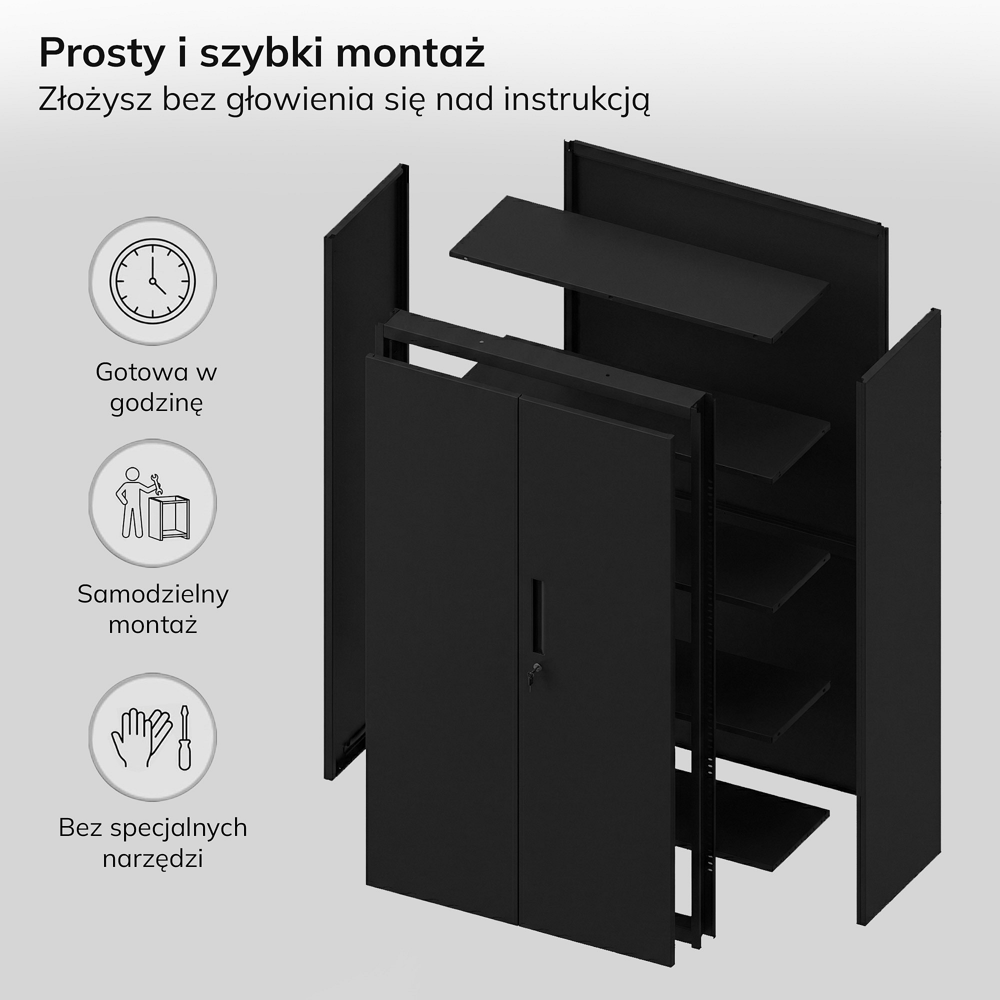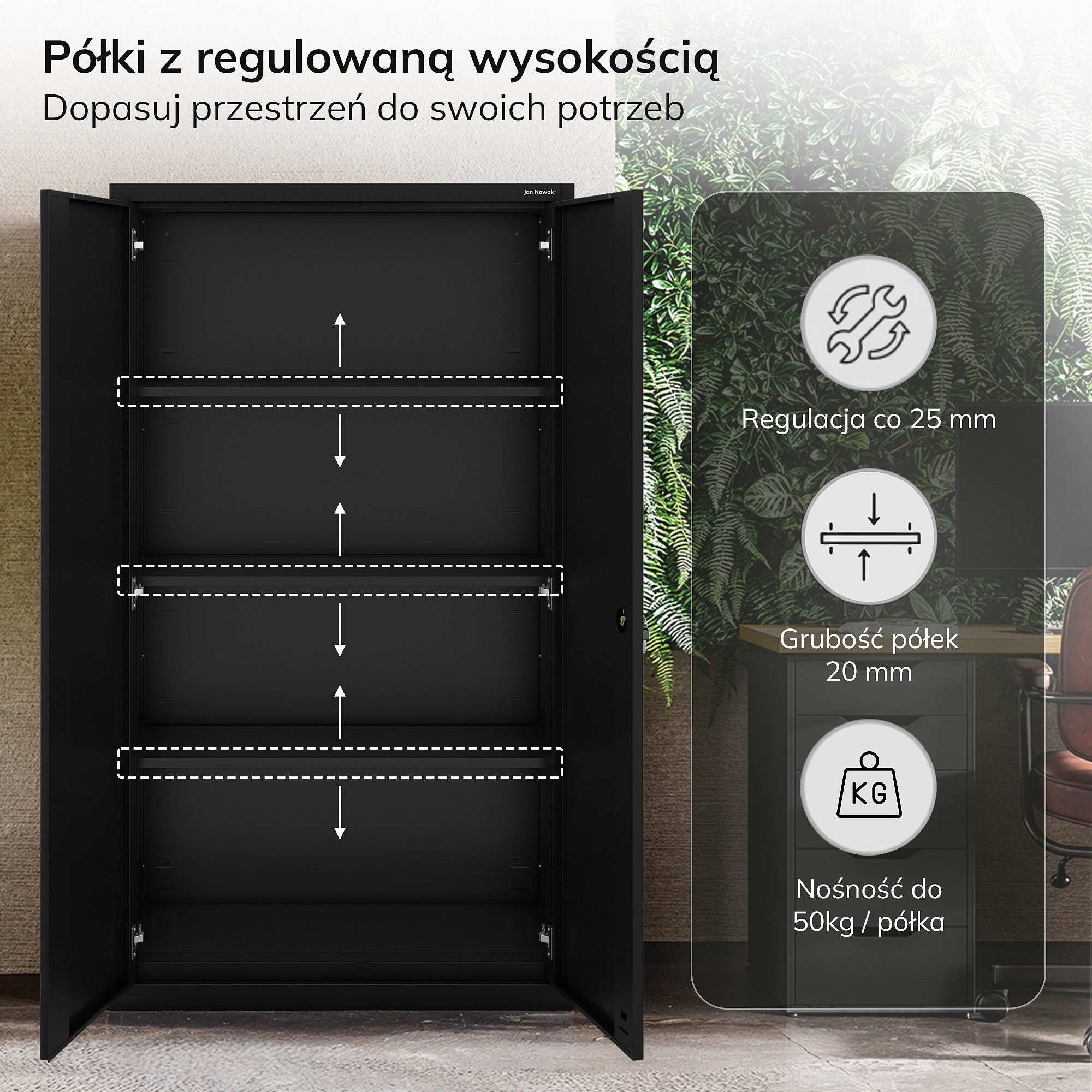 Vnitřek ocelové skříně skrývá tři prostorné police s nastavitelnou výškou po 25 mm a spodní přihrádku. Můžete snadno měnit uspořádání polic, aby co nejlépe vyhovovaly velikosti předmětů. Každá police unese až 50 kg, a dole můžete úspěšně umístit nejtěžší zařízení. Zámek na klíč ve dveřích skříně chrání obsah před přístupem nepovolaných osob a zaručuje bezpečné uložení důležitých dokumentů nebo ostrých nástrojů.