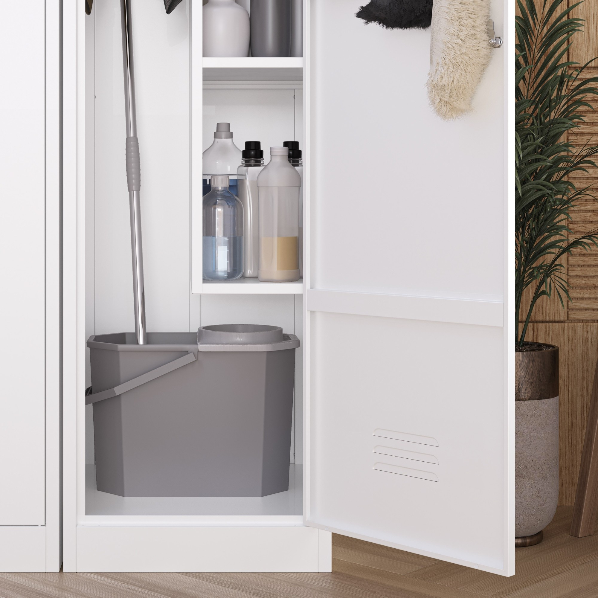 - Praktické zónování: Skříň je chytře rozdělena na několik zón, které vám umožní efektivně uspořádat různé typy úklidových pomůcek.