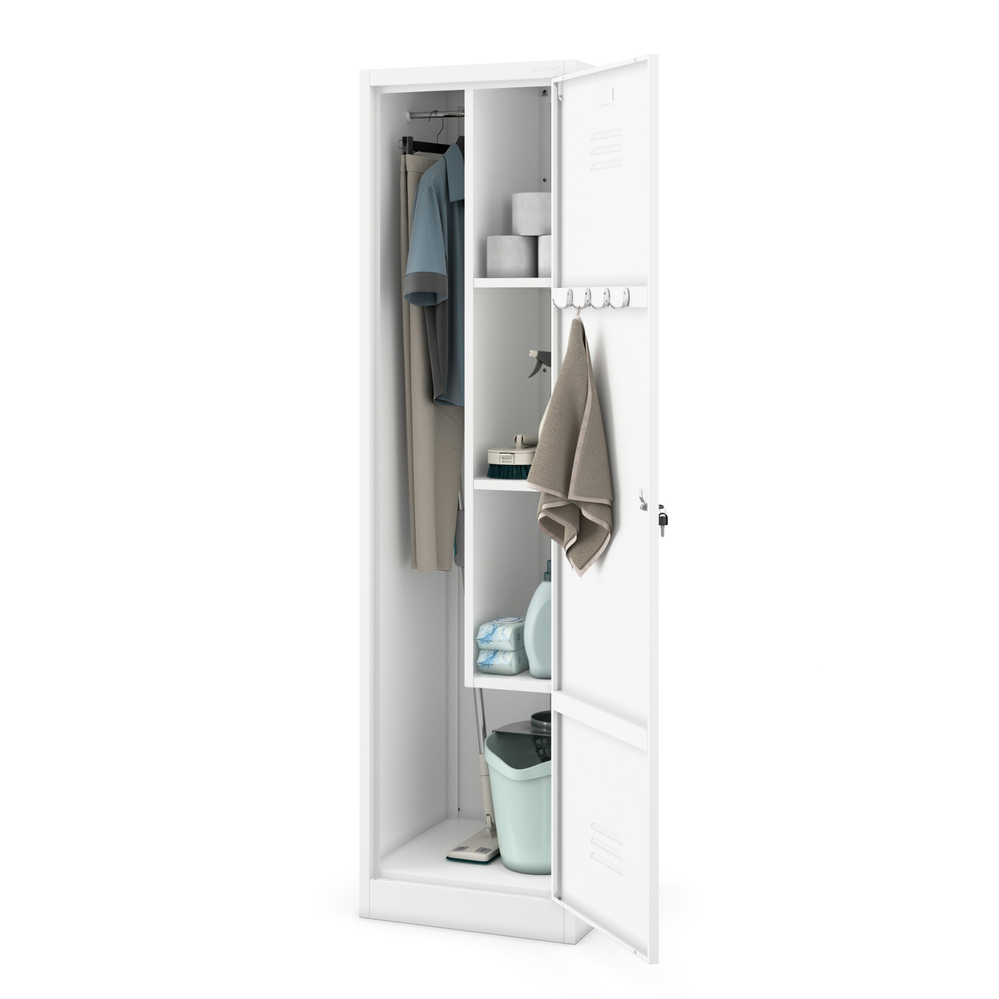 Kovová úklidová skříň AGNES je navržena s ohledem na maximální funkčnost a efektivitu. Každý detail byl pečlivě promyšlen, aby vám usnadnil organizaci a úklid.