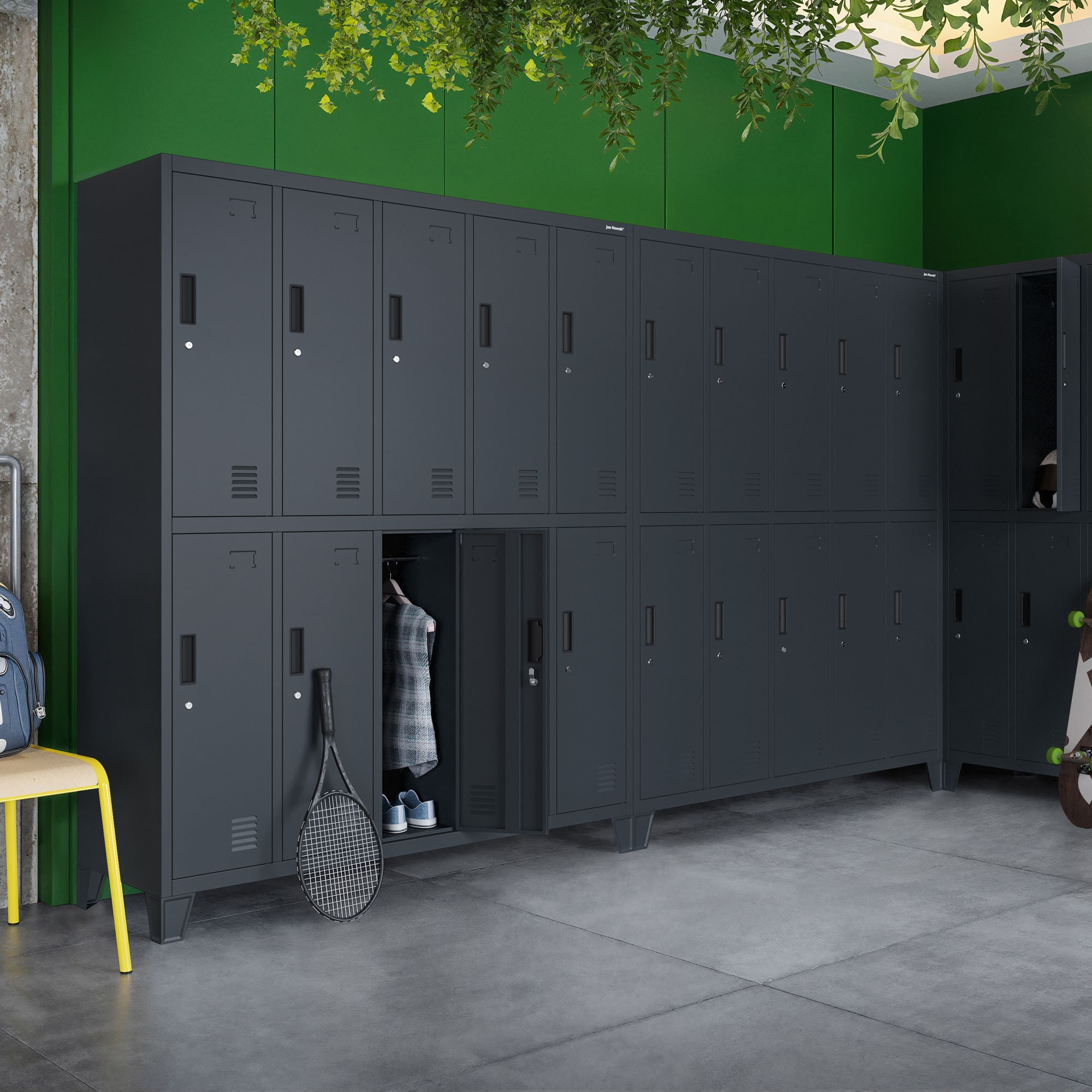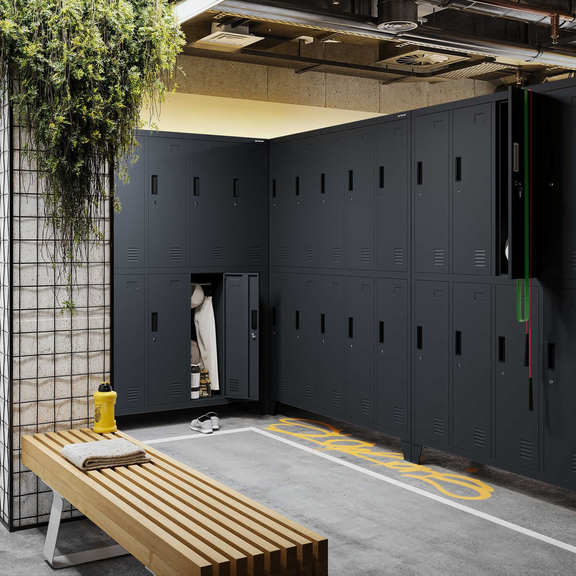 - Uzamykatelné přihrádky: Bezpečné uložení osobních věcí díky individuálním zámkům na klíč.