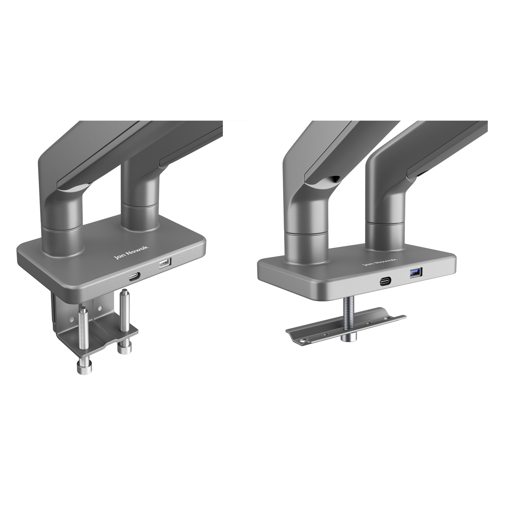Držák JAKE nabízí dva systémy montáže – svorku a průchodku. Svorka je ideální pro stoly s tloušťkou desky od 10 do 80 mm a umožňuje snadnou a rychlou instalaci bez nutnosti vrtání. Průchodka je vhodná pro stoly s tloušťkou desky od 10 do 35 mm a vyžaduje provrtání otvoru. Díky průchodce můžete stůl přisunout těsněji ke zdi.